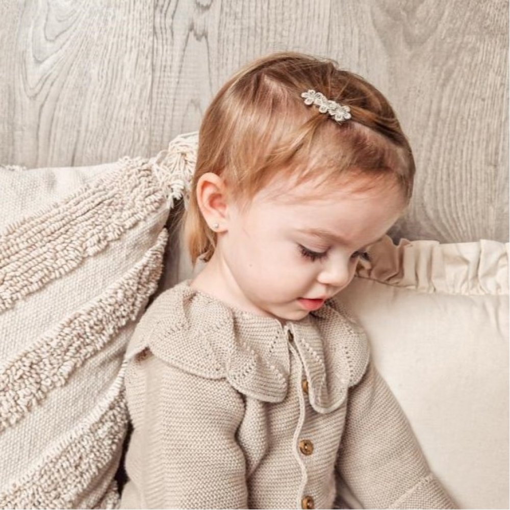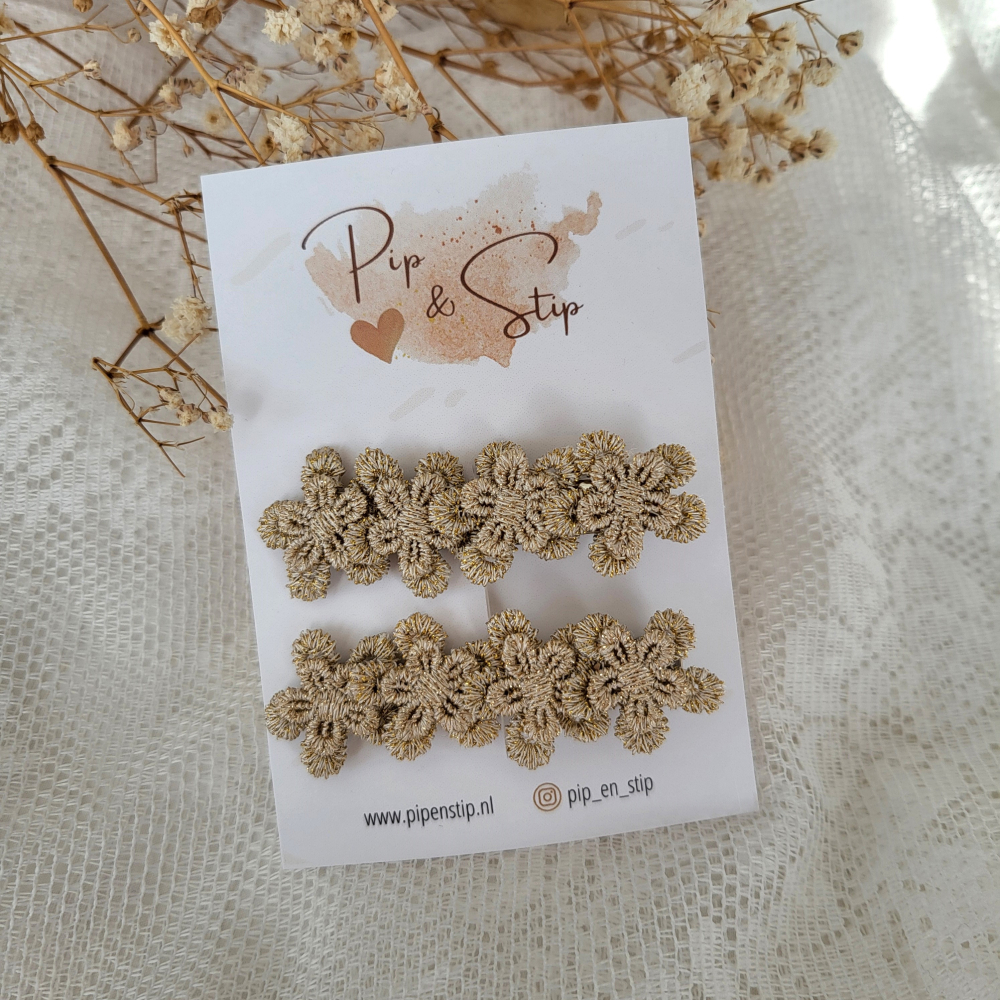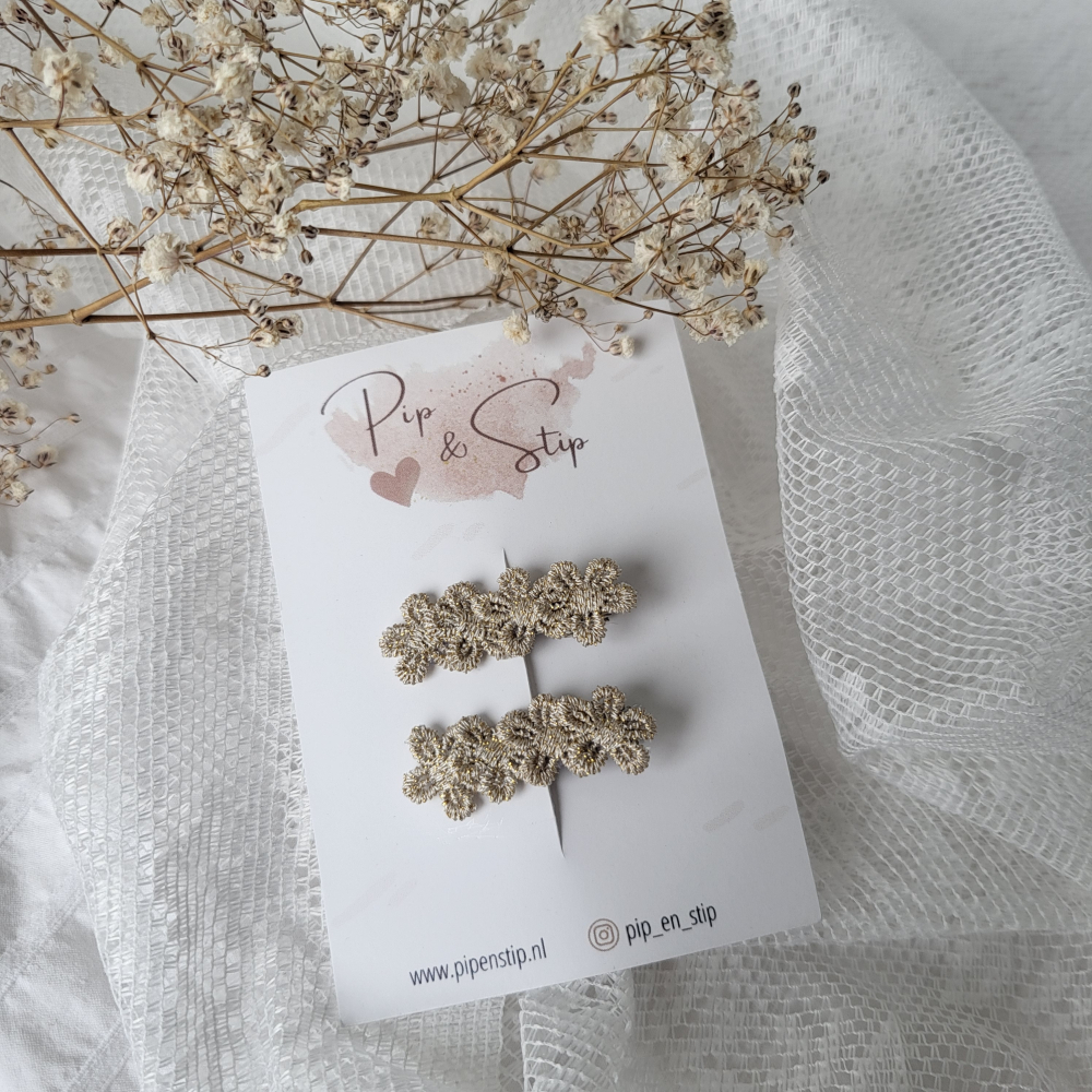 Twee alligator speldjes met goudkleurige bloemetjes.