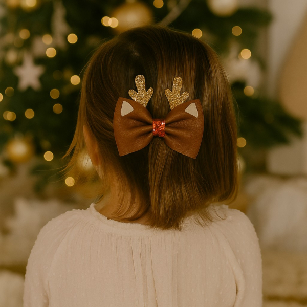 Dit leuke lederlook speldje met rendier strik met glitter is perfect voor de kerstdagen en echt een feestje voor in het haar!