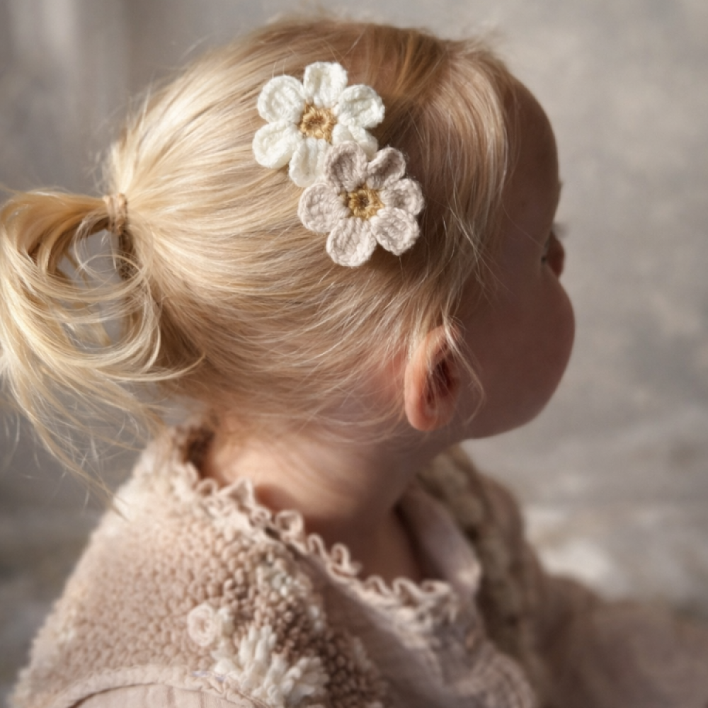 Een zacht alligator haarspeldje met wollen bloemen in lichte kleuren. Combineer het met een gebreid jurkje of een wollen truitje voor de ultieme winterstijl