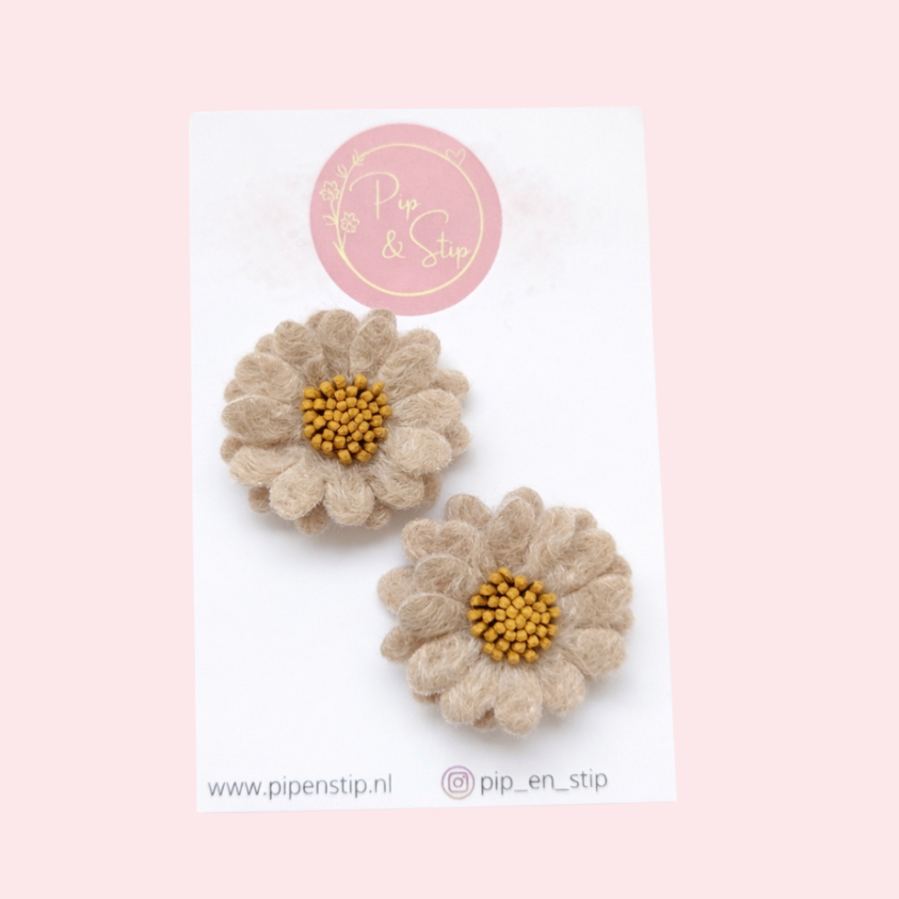 Deze handgemaakte alligator haarspeldjes met beige bloemen zijn een echte eyecatcher. De wollige bloem heeft een zachte en warme uitstraling. Perfect voor speciale momenten, maar ook prachtig om elke dag te dragen.