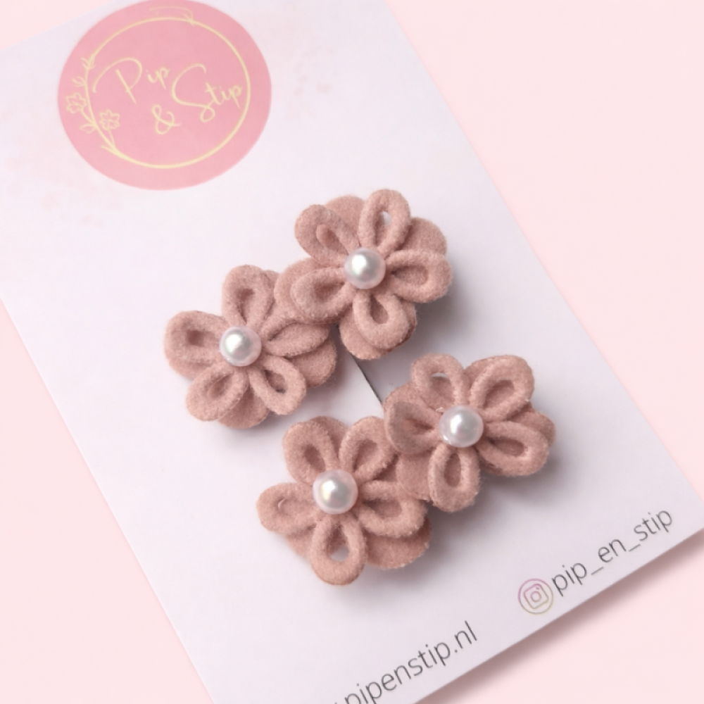 Deze handgemaakte alligator haarspeldjes met oudroze bloemetjes zijn een echte eyecatcher. Het romantische bloemetje heeft een pareltje in het midden wat zorgt voor een elegante en dromerige uitstraling. Perfect voor speciale momenten, maar ook prachtig om elke dag te dragen.