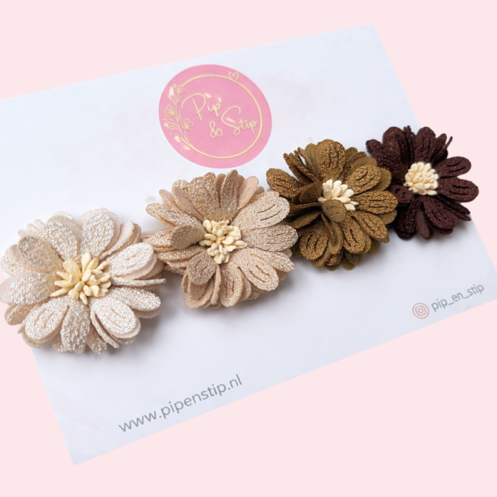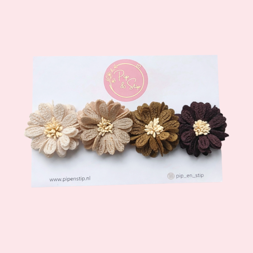 Deze lieve handgemaakte haarspeldjes maken iedere outfit net een beetje mooier. Het setje bestaat uit vier handgemaakte alligatorspeldjes van ongeveer 5 cm groot, elk met een prachtige bloem in herfst tinten. De combinatie is met zorg samengesteld. De kleuren van de bloemen geven een speelse, maar rustige uitstraling.