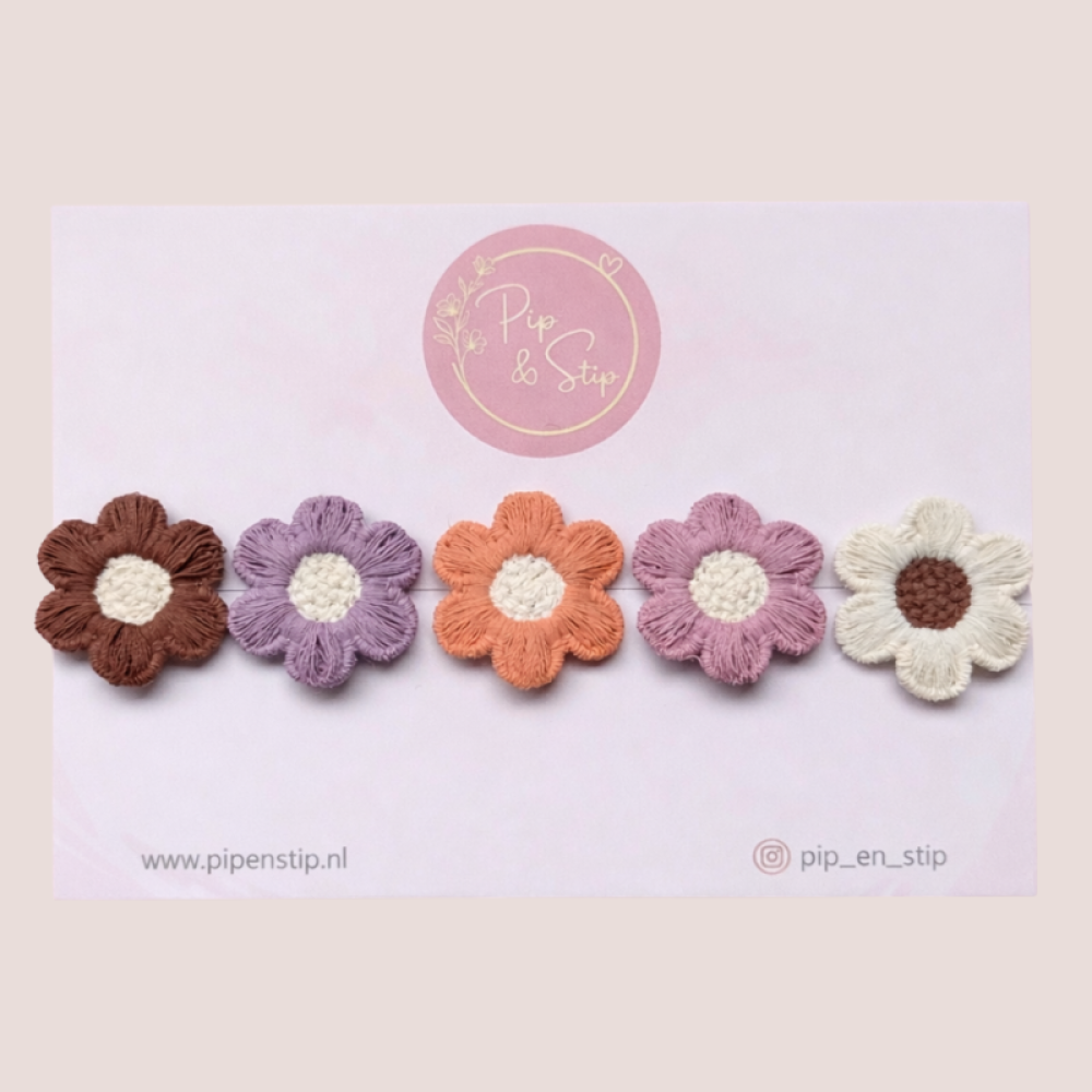 Het setje bestaat uit 5 antislip speldjes met stoffen bloemen in diverse kleuren als wit, oranje, roze, paars en bruin. Dus perfect te matchen met elke outfit.