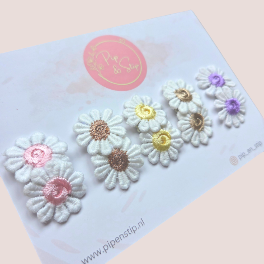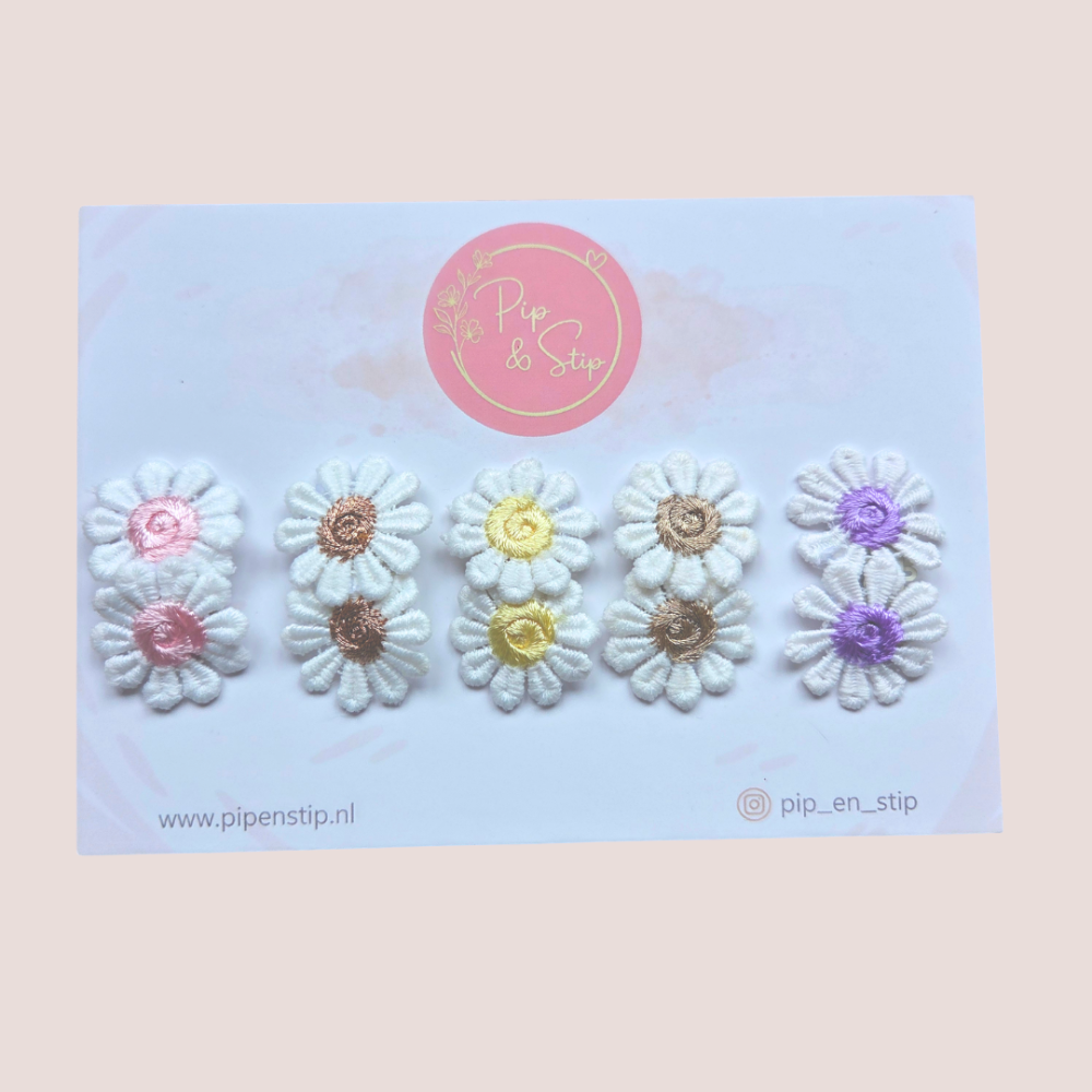 Het setje bestaat uit 5 antislip speldjes met stoffen bloemen in diverse kleuren als geel, brons, roze, paars en goud. Dus perfect te matchen met elke outfit.