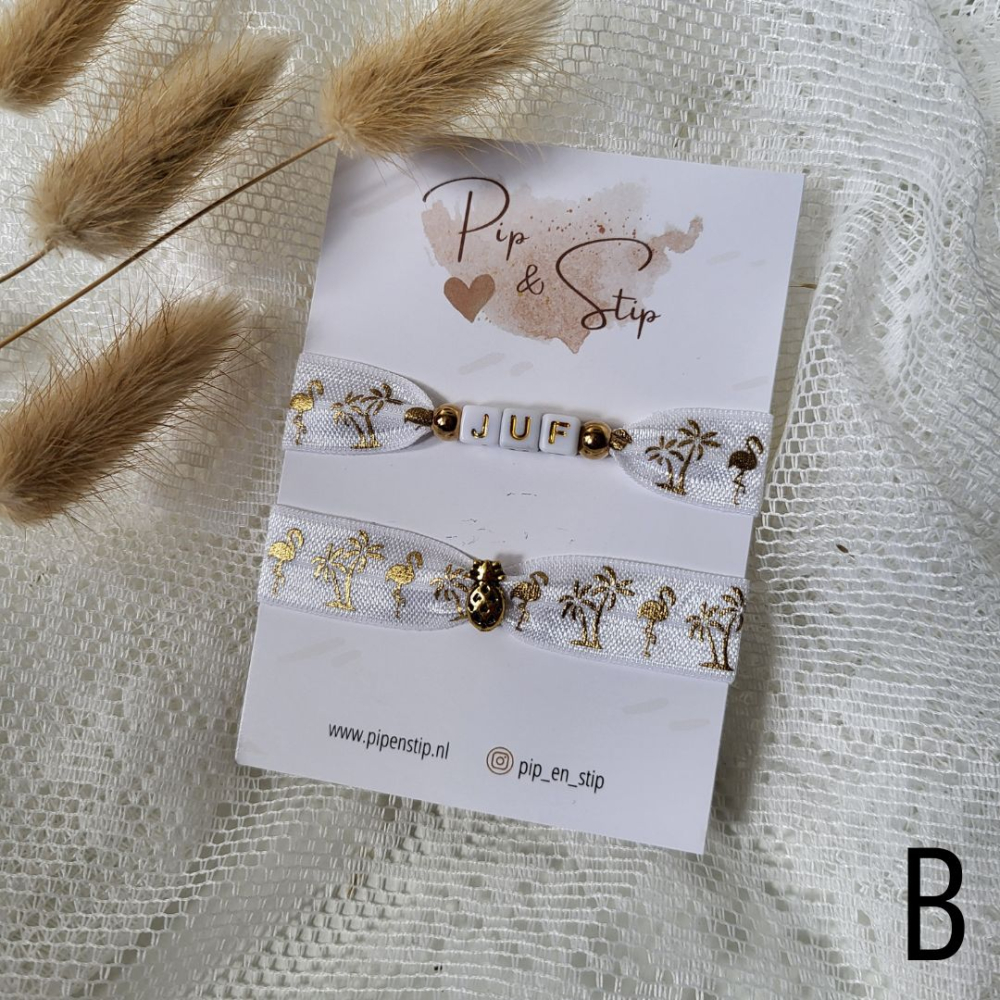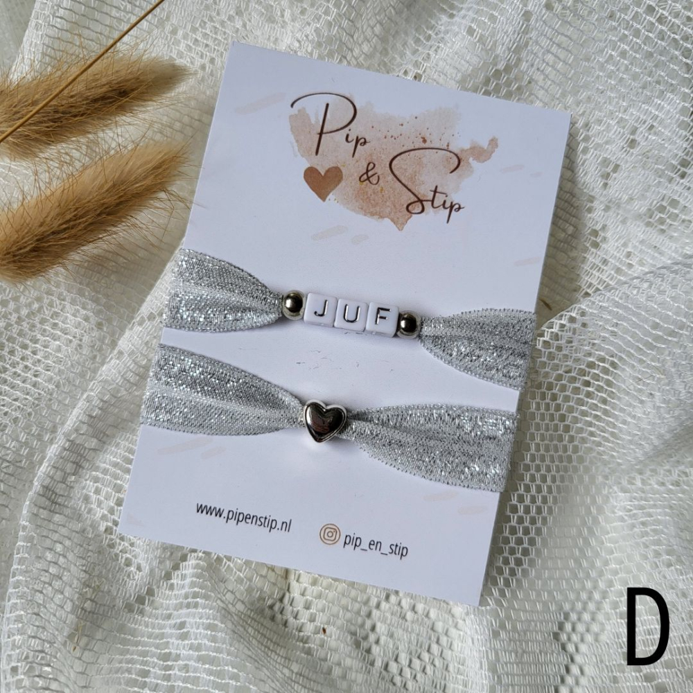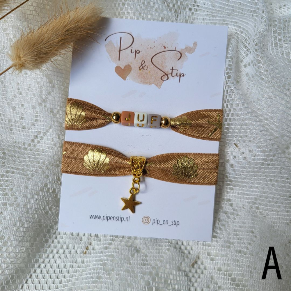 Een armbandje met letterkralen en een bedeltje. De bandjes zijn 25 cm en zelf te knopen.