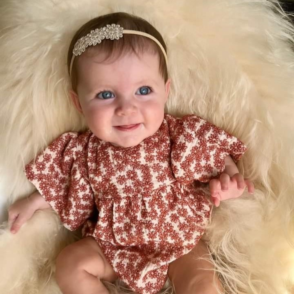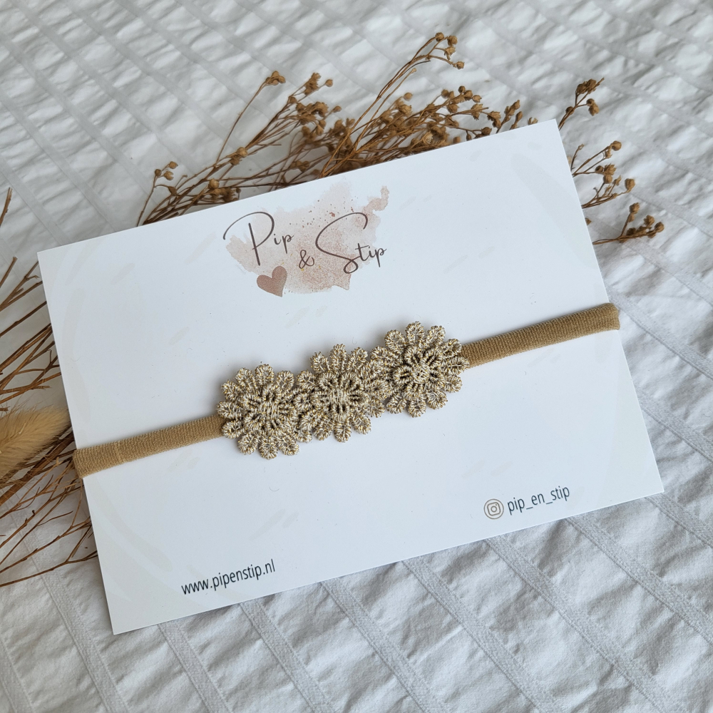 Super lief baby haarbandje met goud/beige bloemetjes.