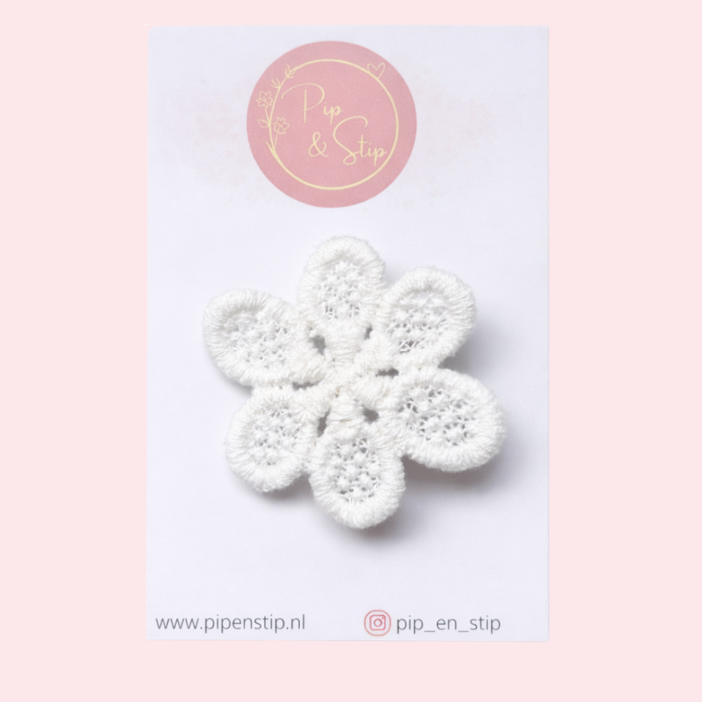 De kanten bloem is ongeveer 5 cm groot en bevestigd op een stevig alligator speldje, zodat hij goed blijft zitten in peuter- en kleuterhaar. Deze handgemaakte bloemen haarspeld is een schattige en stijlvolle haaraccessoire voor meisjes en ook heel leuk om cadeau te geven.