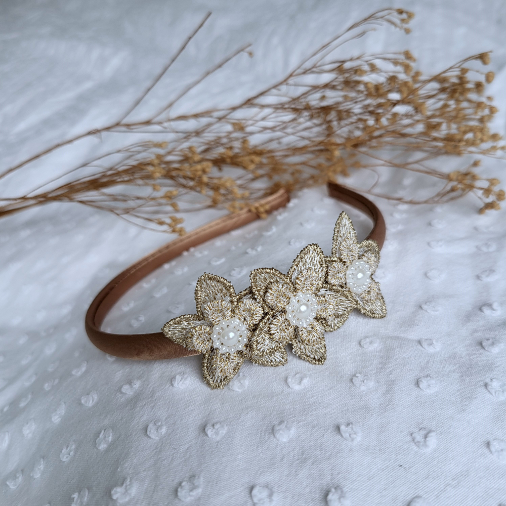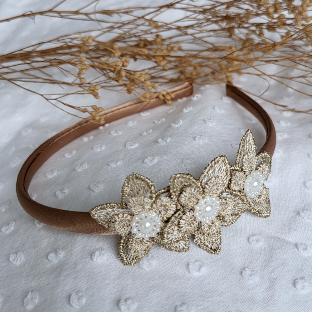 Leuk voor de grotere meiden. Een diadeem van satijn met gouden bloemen en een parel.