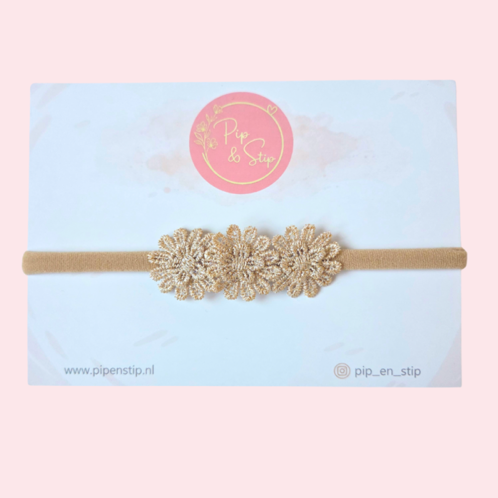 De haarband is afgewerkt met 3 goudkleurige bloemetjes. Subtiel maar precies groot genoeg voor kleine gezichtjes.