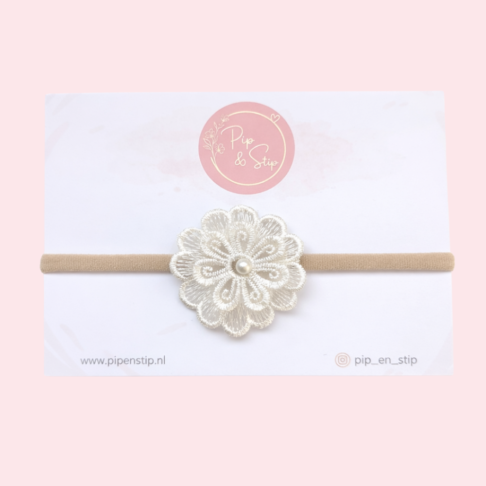De haarband is afgewerkt met een mooie kanten bloem van ongeveer 4,5 cm. De bloem is lekker vol en valt mooi op, zonder te groot te zijn voor kleine gezichtjes.