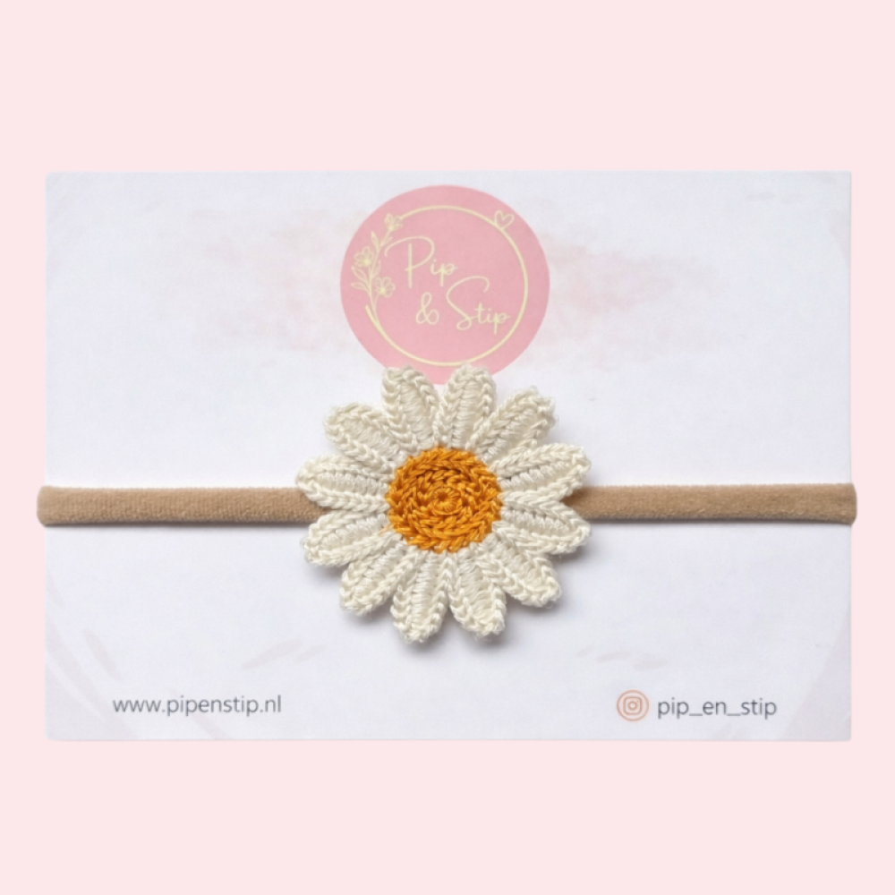 De haarband is afgewerkt met een mooie zonnebloem van ongeveer 5 cm. Leuk voor een vrolijke lente- of zomerdag!