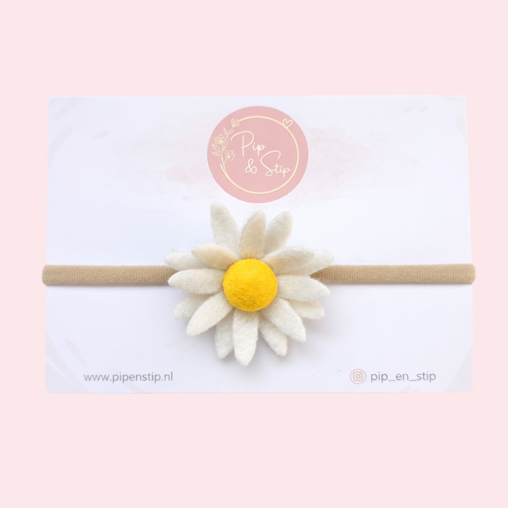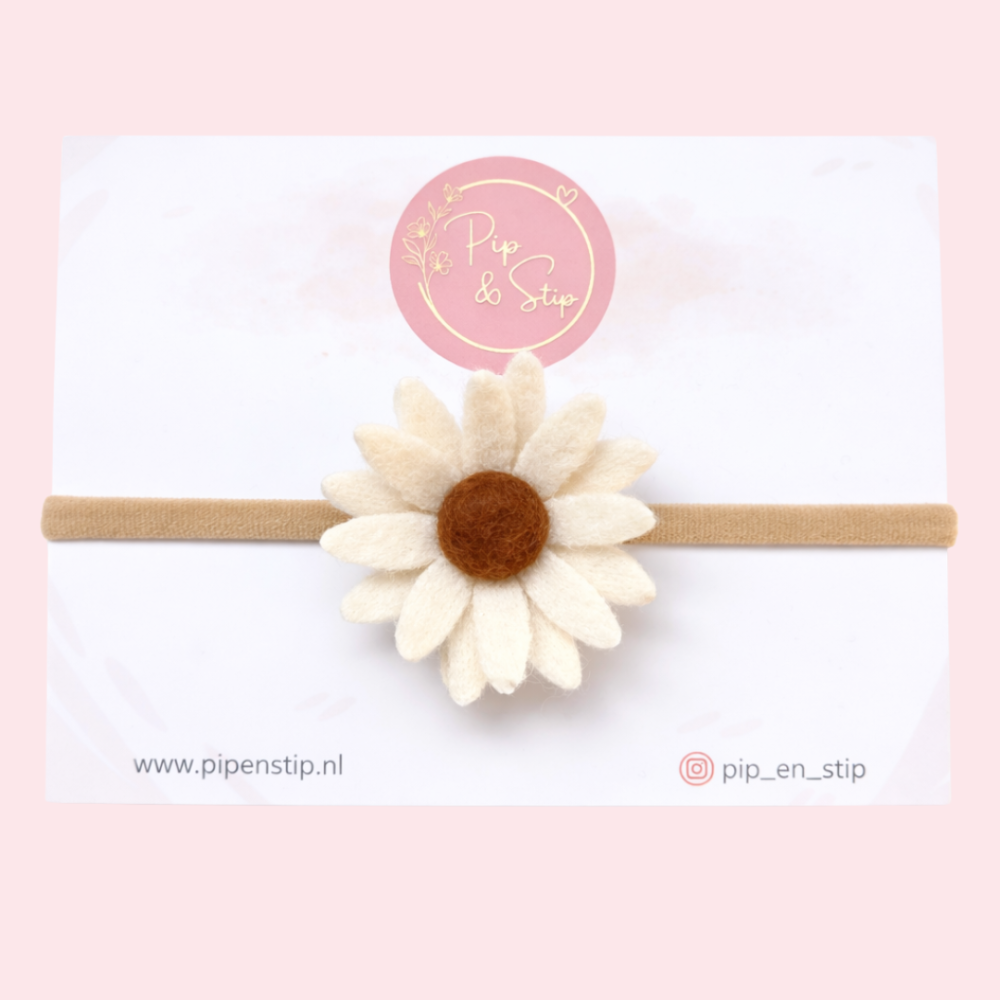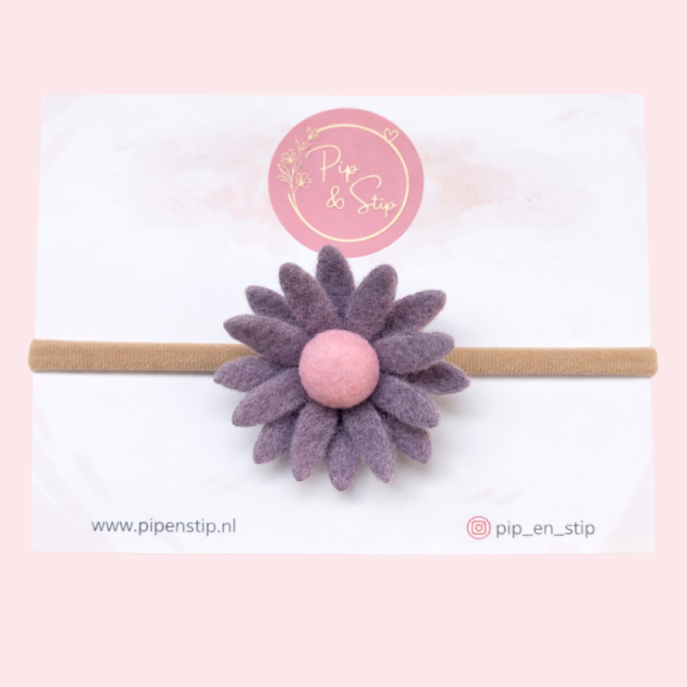 De haarband is afgewerkt met een mooie wol vilten bloem van ongeveer 5 cm. De bloem is lekker vol en valt mooi op, zonder te groot te zijn voor kleine gezichtjes.