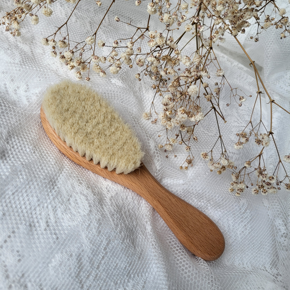 Een super zacht haarborsteltje met geitenhaar voor de fijne babyhaartjes.