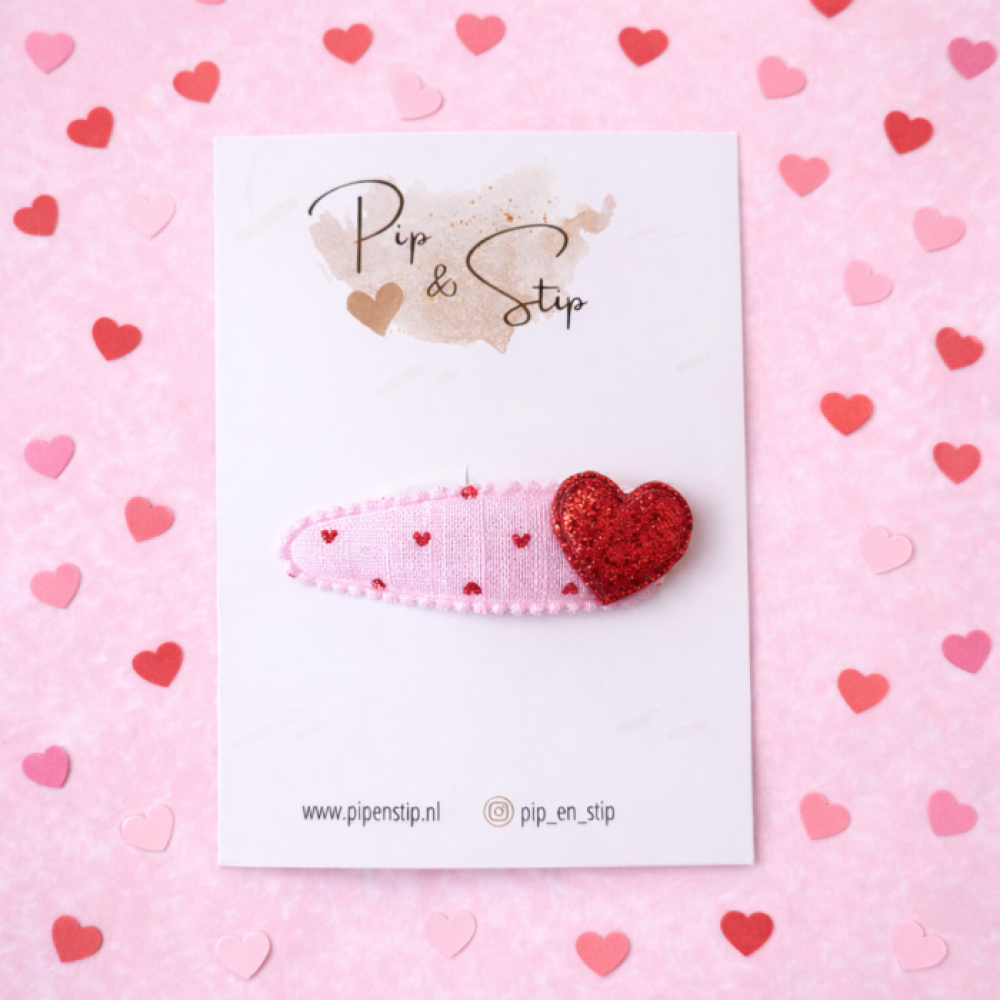 Een lief klikklak haarspeldje van lichtroze stof met rode hartjes en een rood glitterhartje. Perfect om een lokje uit het gezicht te houden of om een kapseltje nét dat beetje extra te geven. Het glitter hartje heeft vrolijke uitstraling waar kleine meiden dol op zijn.