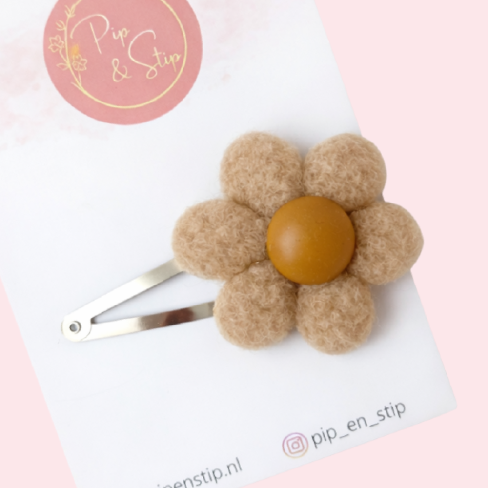 Dit lieve klikklak haarspeldje met teddy bloem maken elke outfit nog vrolijker. De speldjes zijn ongeveer 5,5 cm groot en met een zachte bloem in beige en honing kleuren. Perfect voor losse plukjes, een staartje of gewoon als vrolijk detail in het haar.