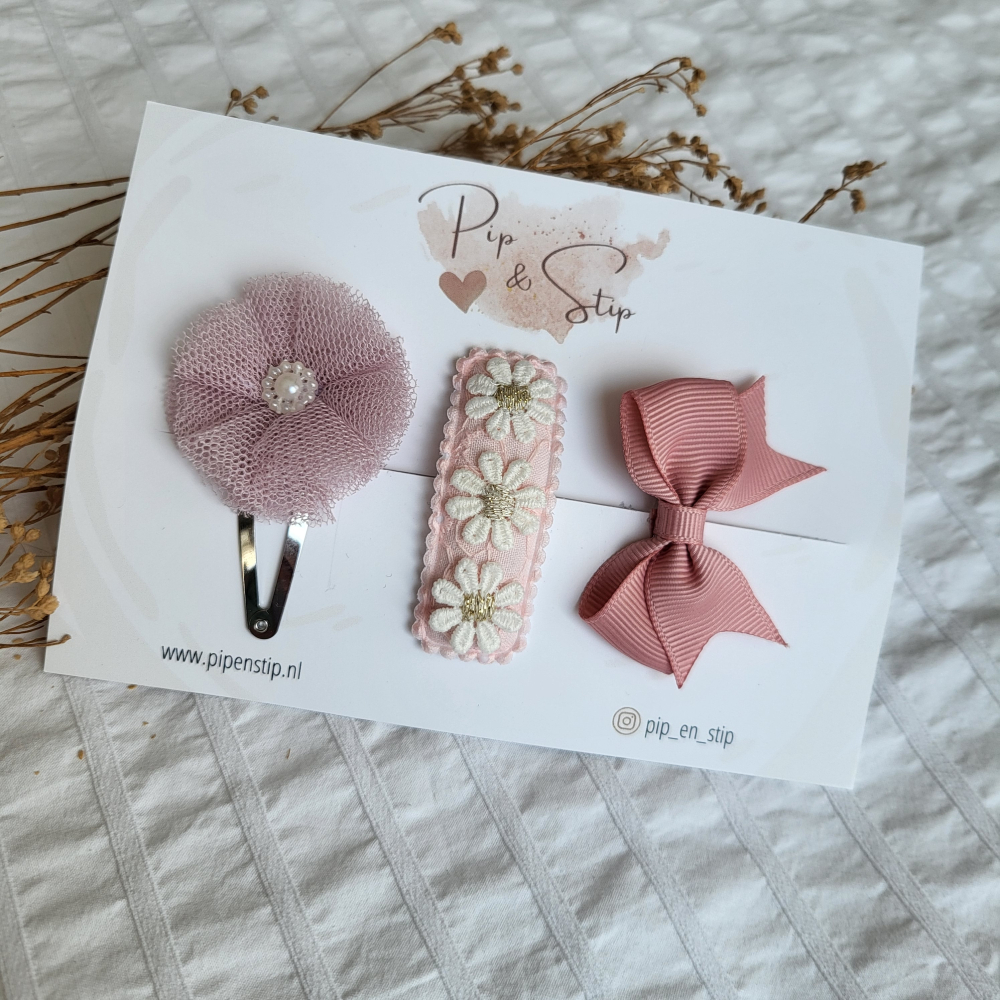 Setje van 3 diverse haarspeldjes in roze tinten.