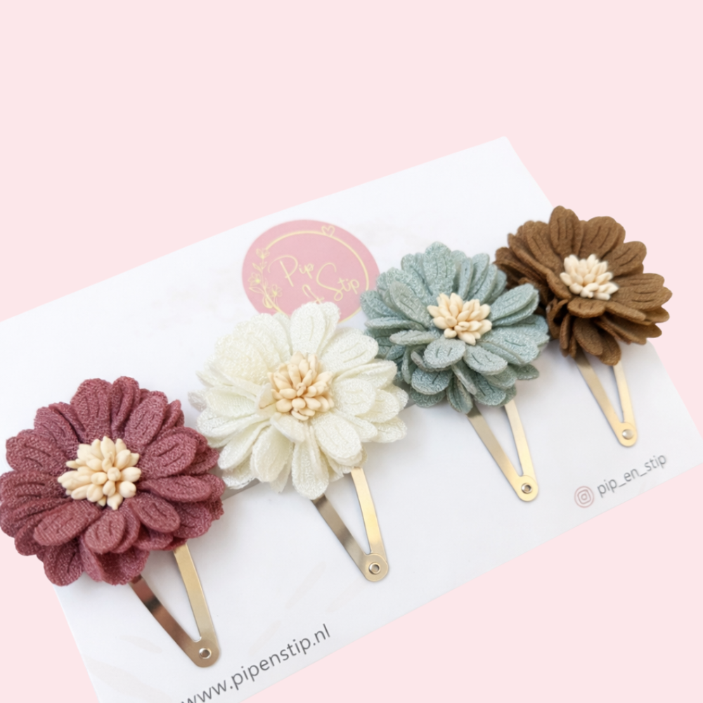 Deze lieve handgemaakte haarspeldjes maken iedere outfit net een beetje mooier. Het setje bestaat uit vier handgemaakte klikklak speldjes van ongeveer 5,5 cm groot, elk met een prachtige bloem in zachte tinten. De combinatie is met zorg samengesteld. De kleuren van de bloemen geven een speelse, maar rustige uitstraling.