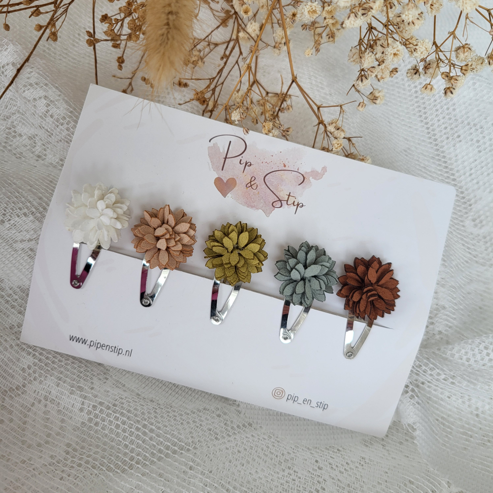 Setje van 5 haarspeldjes met lederlook bloemetjes.