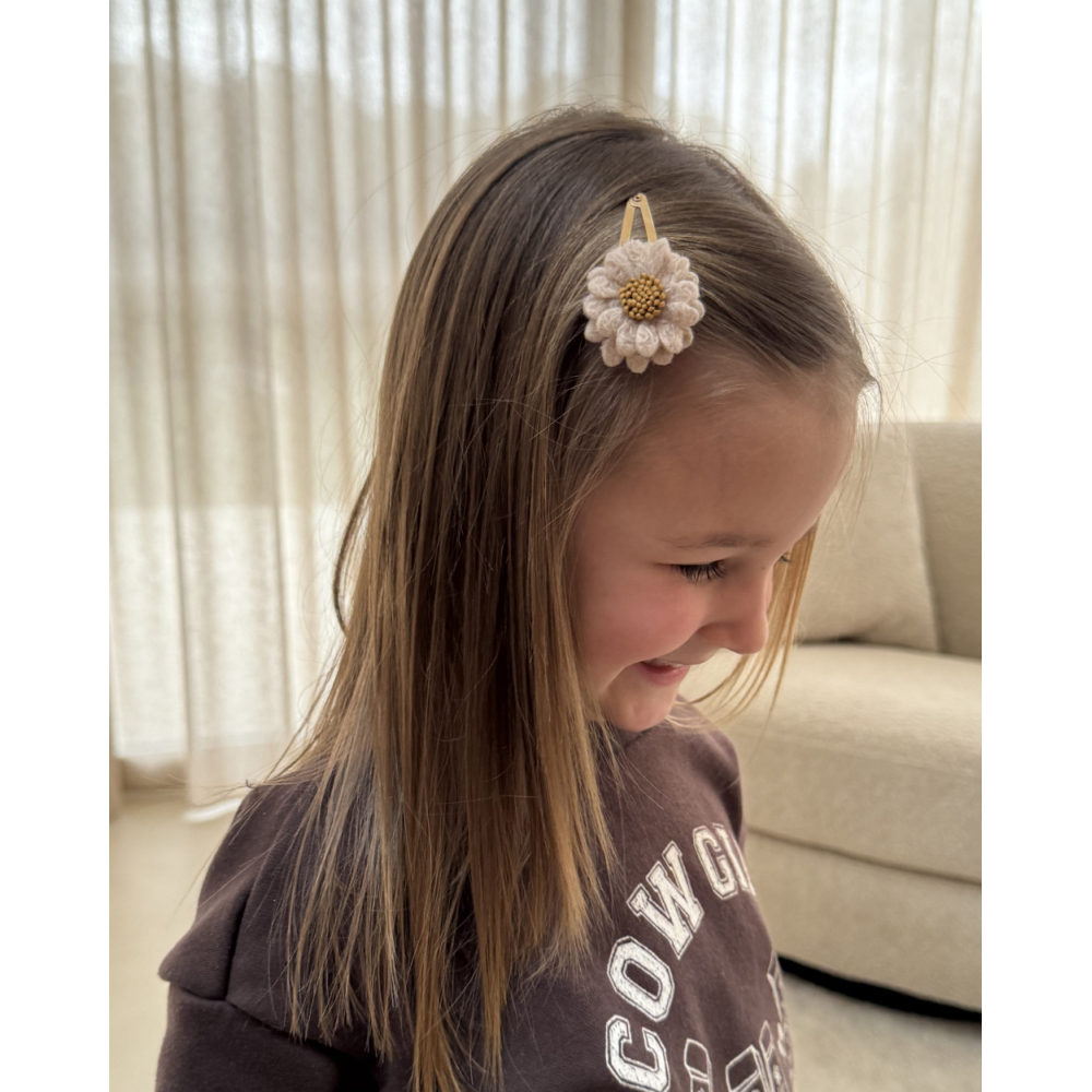 Deze handgemaakte klikklak haarspeldjes met lichtroze bloemen zijn een echte eyecatcher. De wollige bloem heeft een zachte en warme uitstraling. Perfect voor speciale momenten, maar ook prachtig om elke dag te dragen.