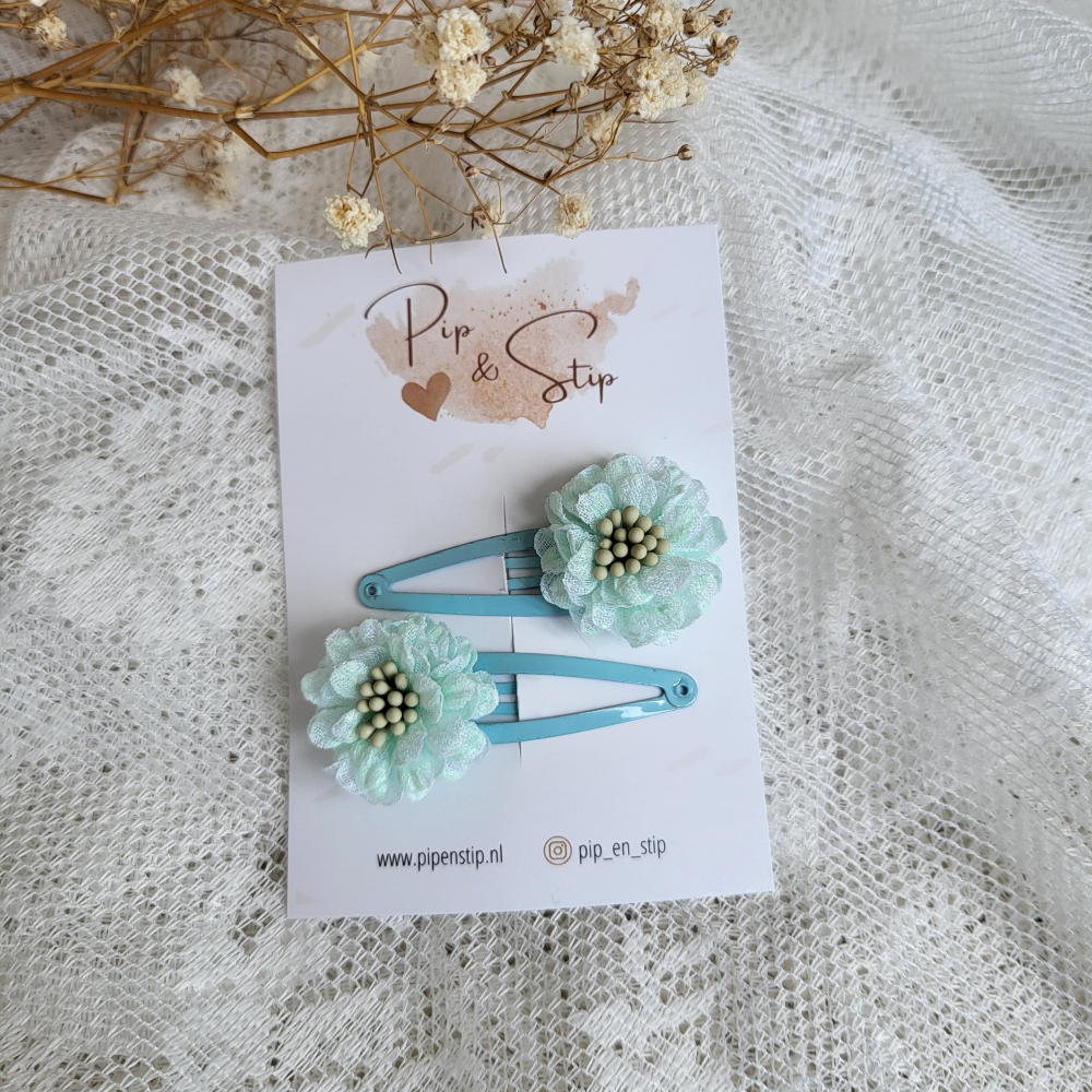 Twee gekleurde klikklak haarspeldjes met een bloem.