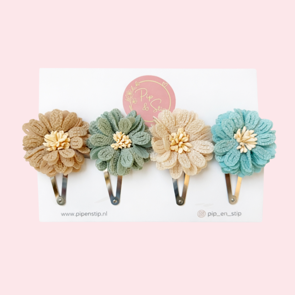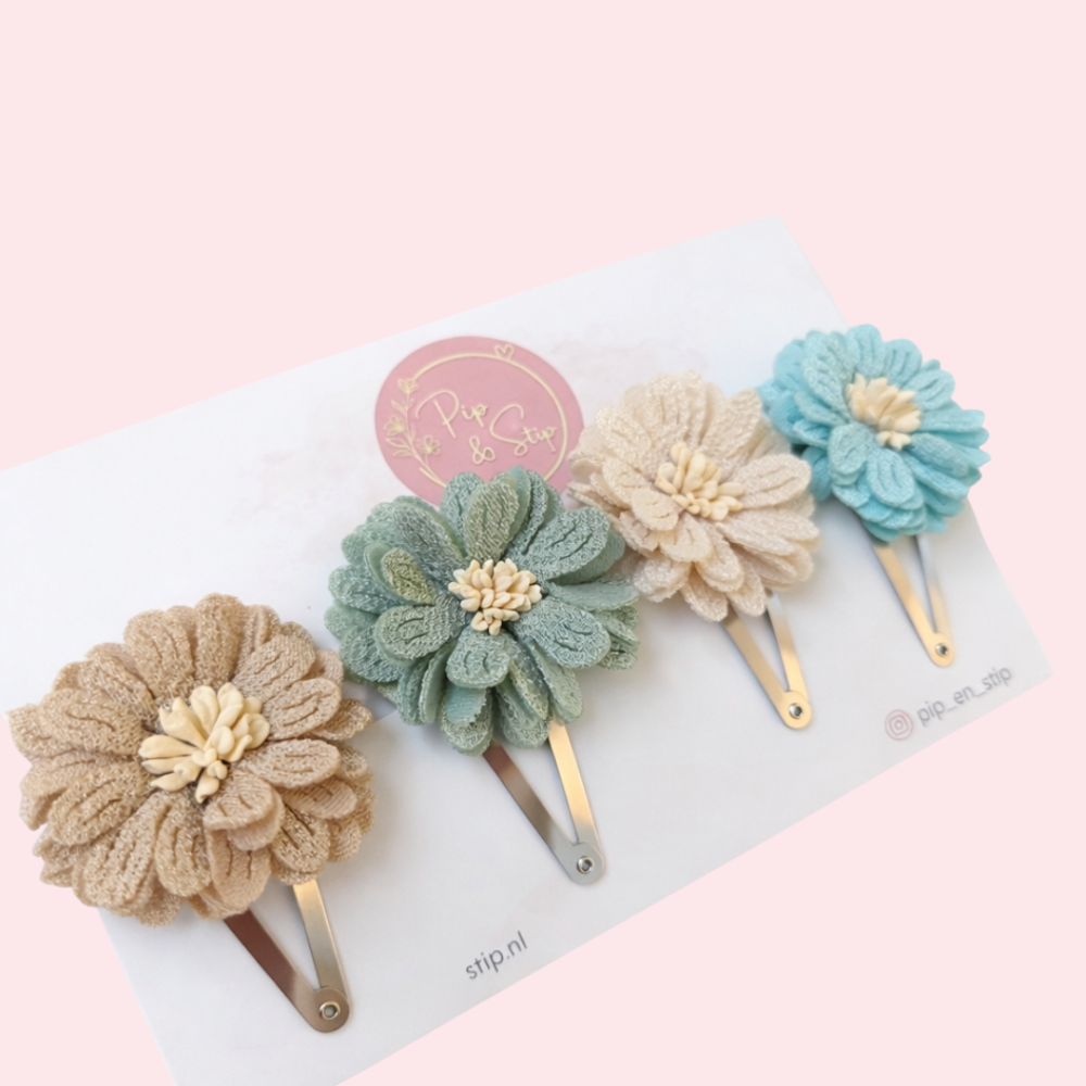 Deze lieve handgemaakte haarspeldjes maken iedere outfit net een beetje mooier. Het setje bestaat uit vier handgemaakte klikklak speldjes van ongeveer 5,5 cm groot, elk met een prachtige bloem in zachte tinten. De combinatie is met zorg samengesteld. De kleuren van de bloemen geven een speelse, maar rustige uitstraling.