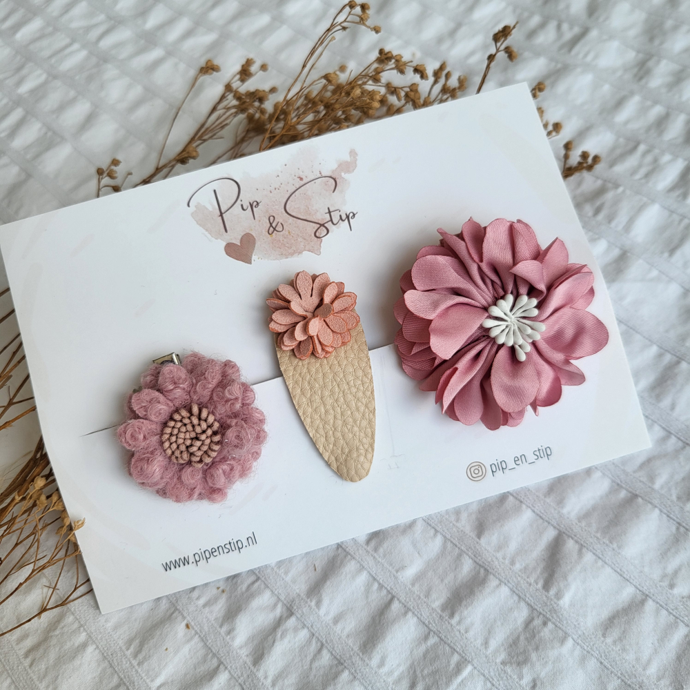 Setje van 3 diverse haarspeldjes in roze tinten. Met 2 alligator haarspeldjes en 1 klikklakspeldje.