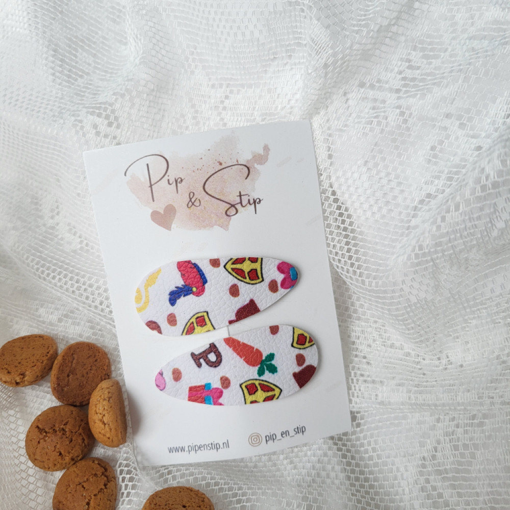Deze vrolijke Sinterklaas haarspeldjes maken elk kapsel extra feestelijk in de gezelligste tijd van het jaar! De speldjes zijn handgemaakt van lederlook met Sinterklaas print en blijven goed zitten in het haar. De haarspeldjes in maat mini zijn ongeveer 3,5 cm groot en in maat maxi 5,5 cm, makkelijk te gebruiken en perfect om te dragen tijdens het Sinterklaasfeest, tijdens de intocht of gewoon op een gewone dag om alvast in de feeststemming te komen. Met deze lieve haarspeldjes straalt elk kind van top tot teen in echte Sinterklaasstijl!