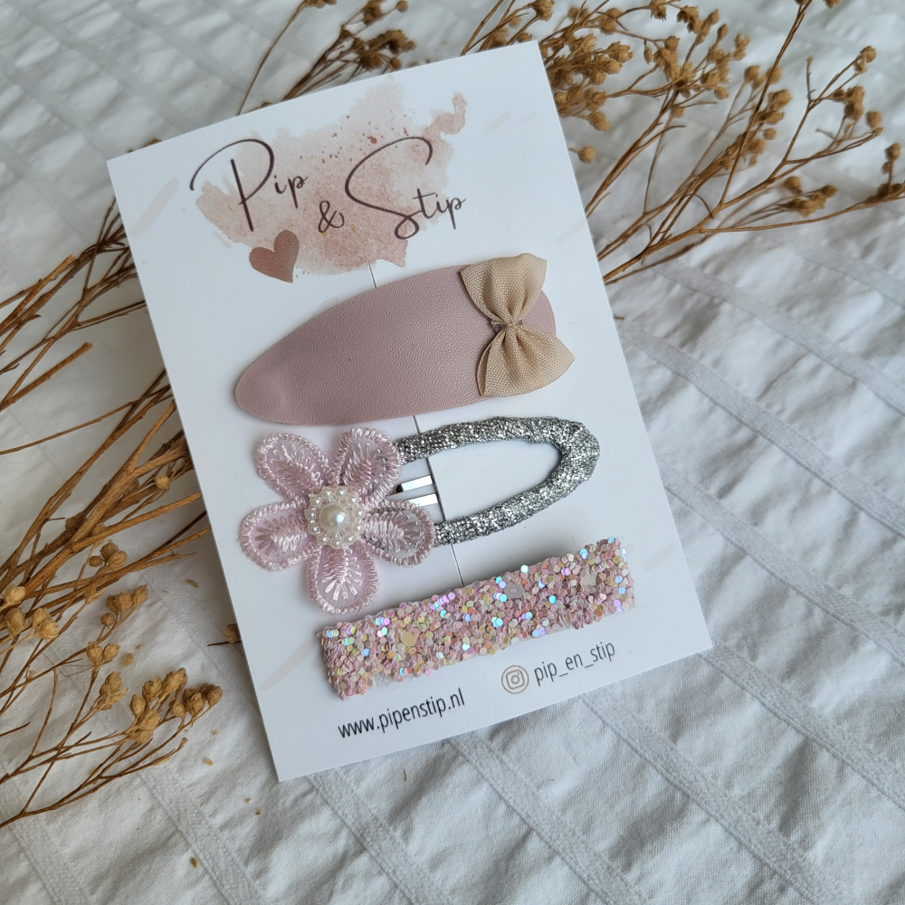Setje van 3 diverse haarspeldjes in roze tinten.