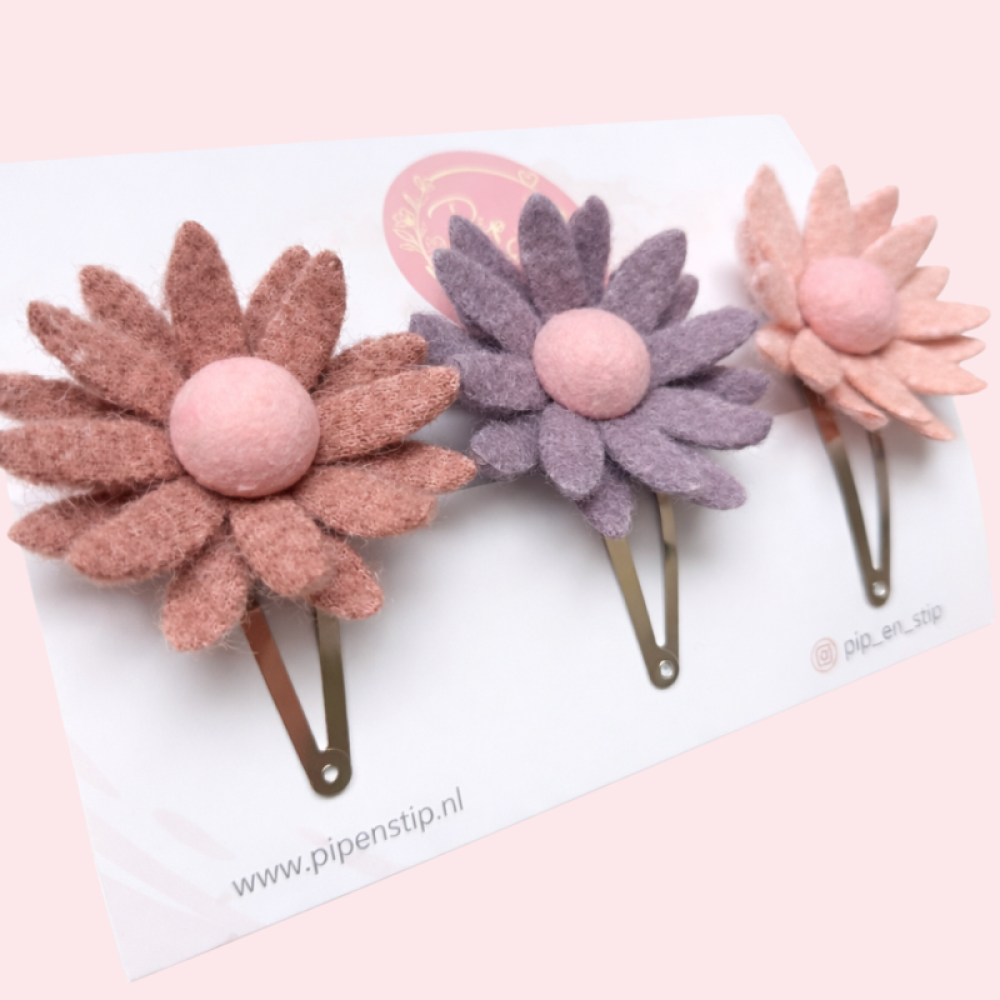 Dit setje lieve klikklak haarspeldjes met bloemen maken elke outfit nog vrolijker. De speldjes zijn ongeveer 5,5 cm groot en met een zachte bloem in prachtige kleuren. Perfect voor losse plukjes, een staartje of gewoon als vrolijk detail in het haar.
