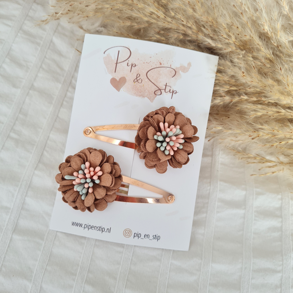 Setje van 2 haarspeldjes met lederlook bloemetjes. Deze haarspeldjes zijn ongeveer 5,5 cm.
