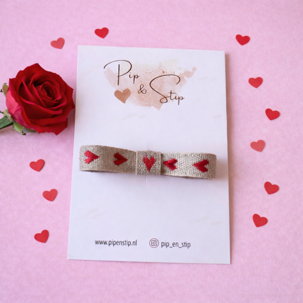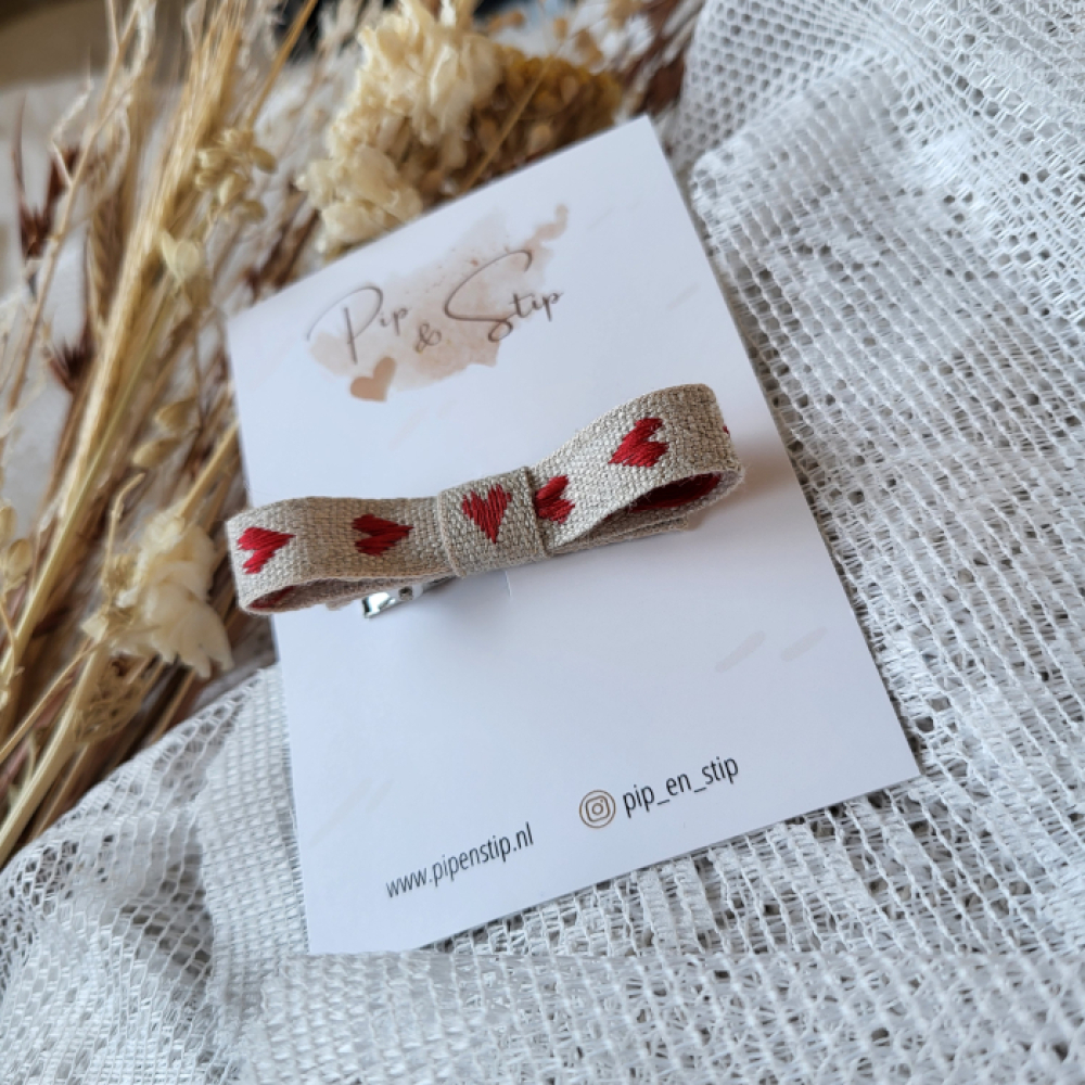 Het strikje is handgemaakt van linnen lint in zachte kleuren die perfect passen bij Valentijnsdag of een speciale gelegenheid.
