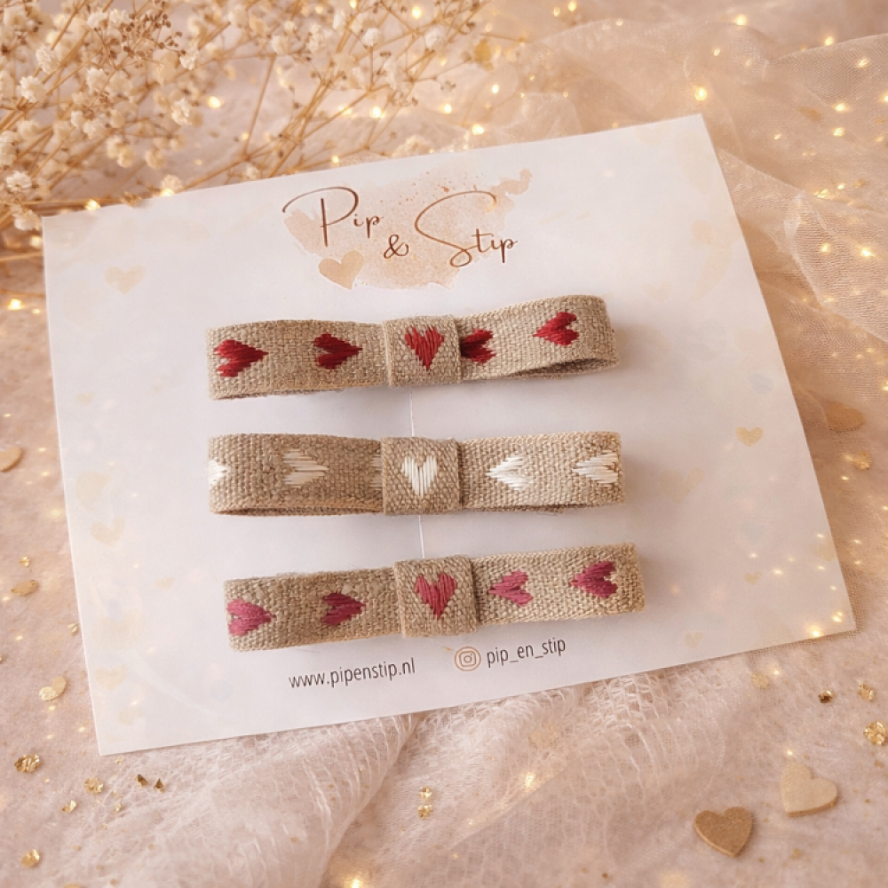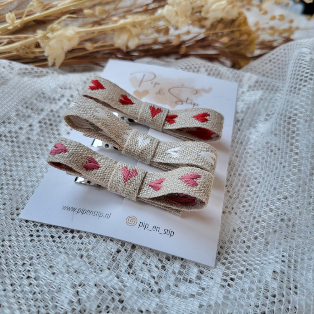 Je ontvangt een setje van 3 strikjes met rode, oudroze en witte hartjes. Koop je ze liever per stuk? Klik dan hier.