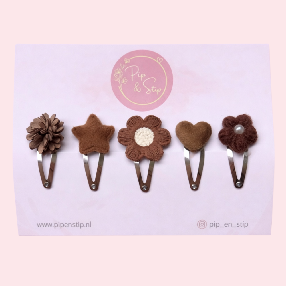 Setje van 5 haarspeldjes. Verkrijgbaar in maat mini (3,5 cm) en maxi (5,5 cm) LET OP! De mini haarspeldjes zijn alleen verkrijgbaar in zilver en goud!