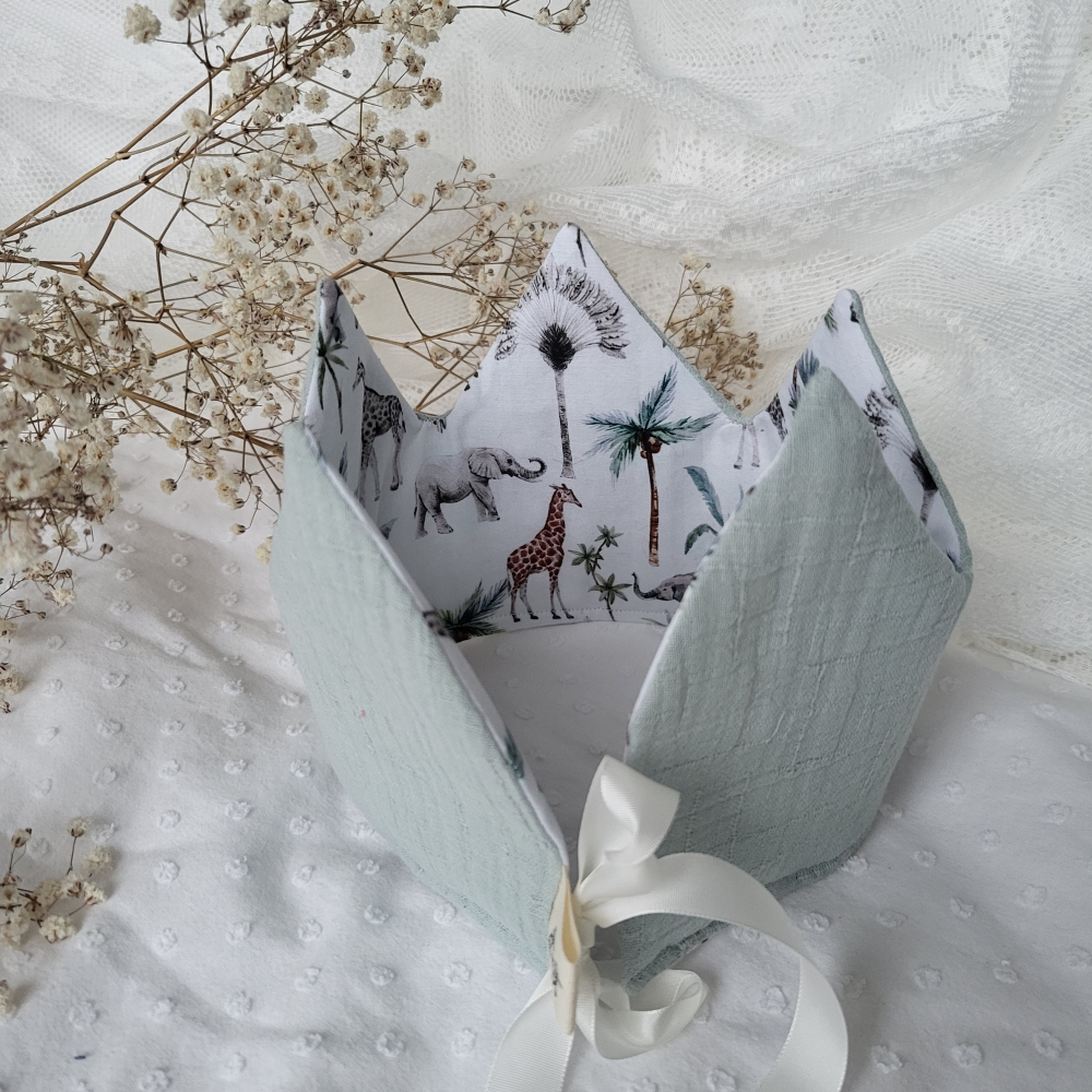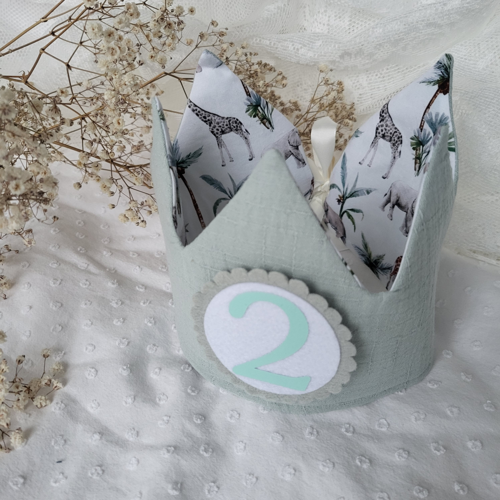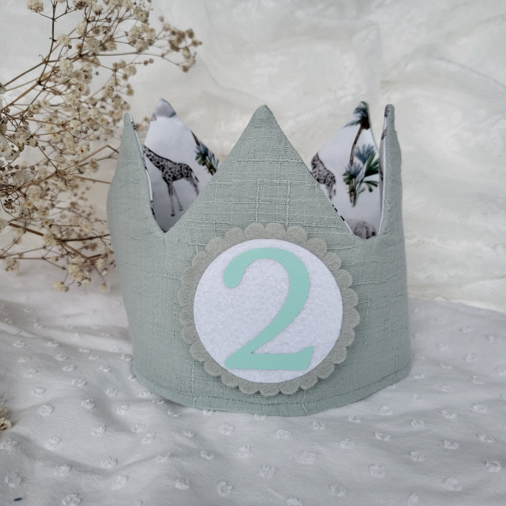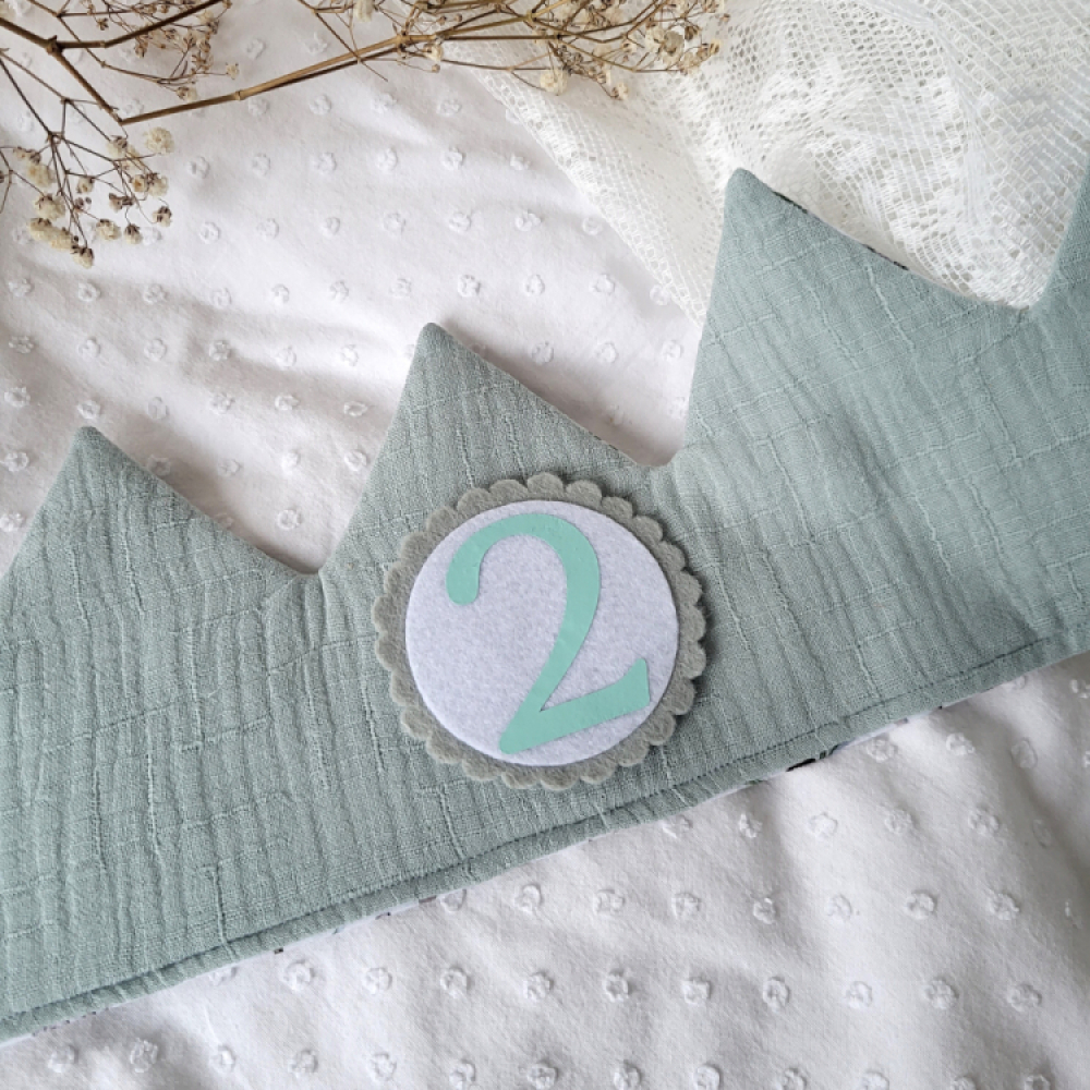 Deze vrolijke verjaardagskroon van bamboe stof ijsblauw (stof 19) en katoen safari (stof 25) maakt het feest compleet!