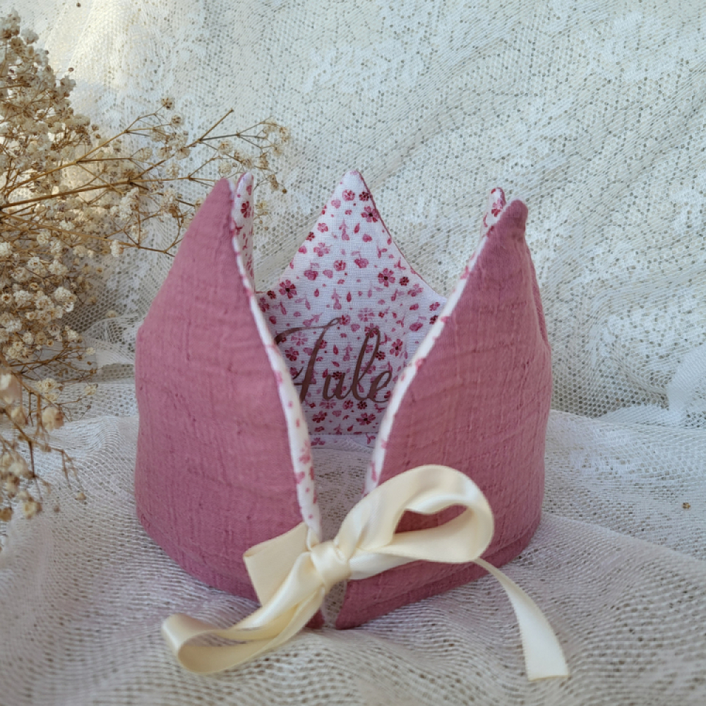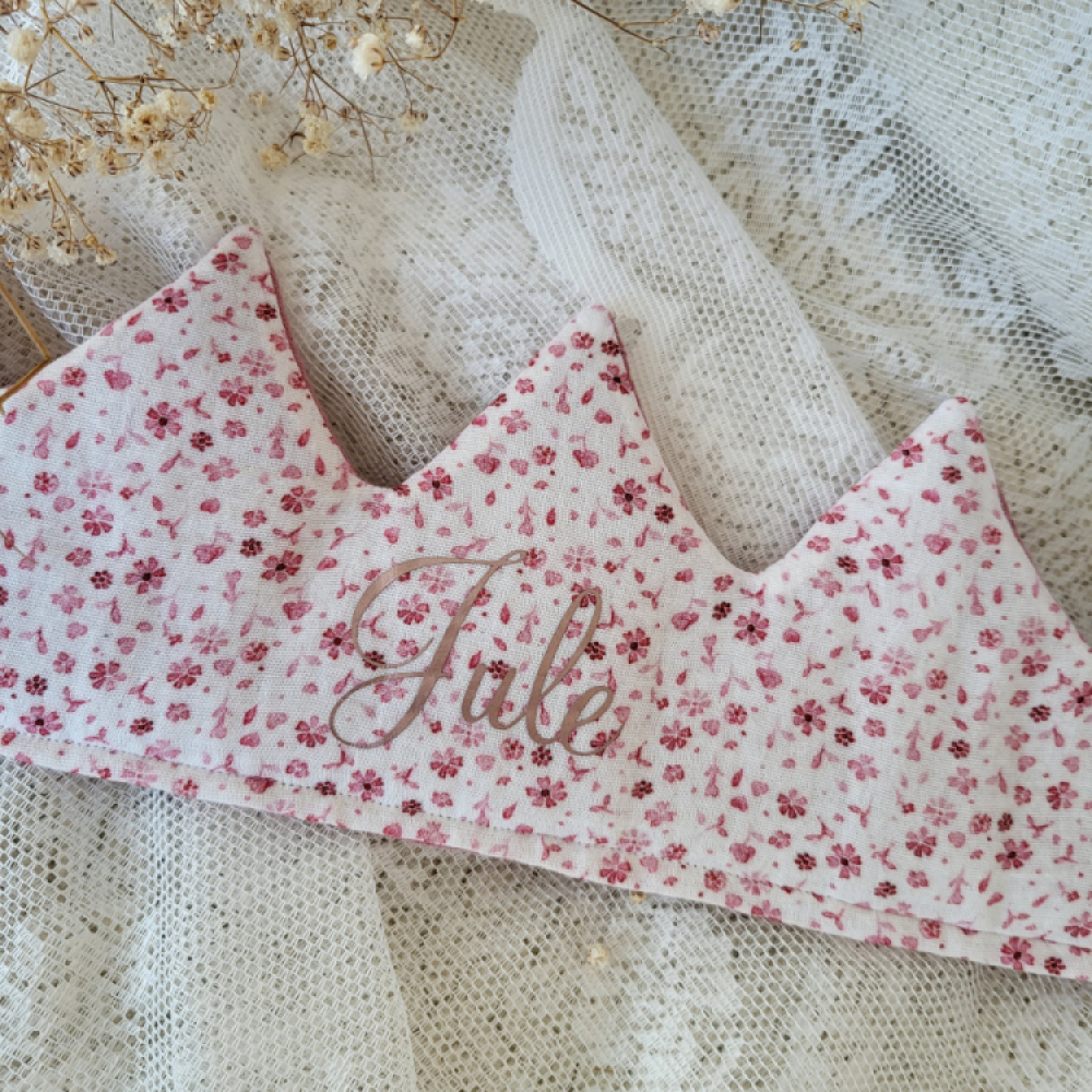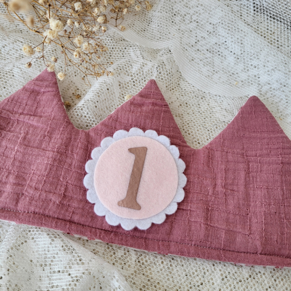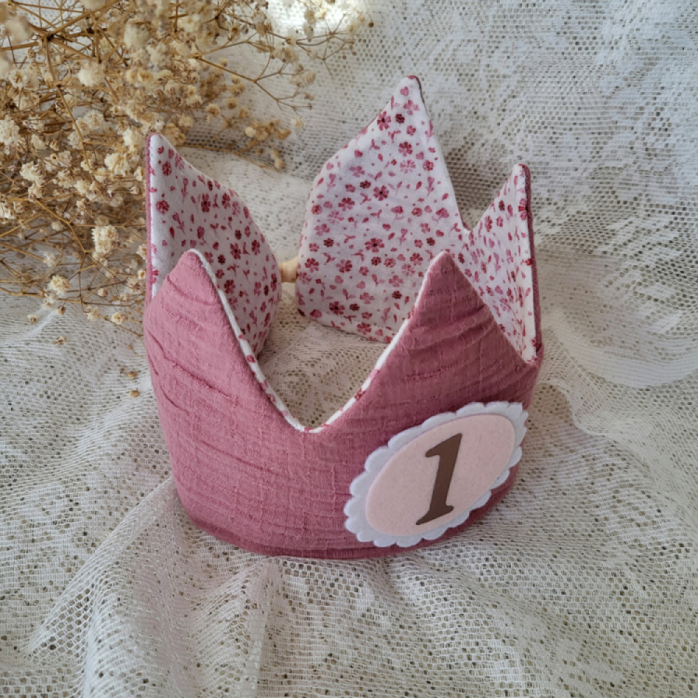 Deze vrolijke verjaardagskroon van bamboe roze (stof 18) en hydrofiel bloemetjes roze (stof 13) maakt het feest compleet!