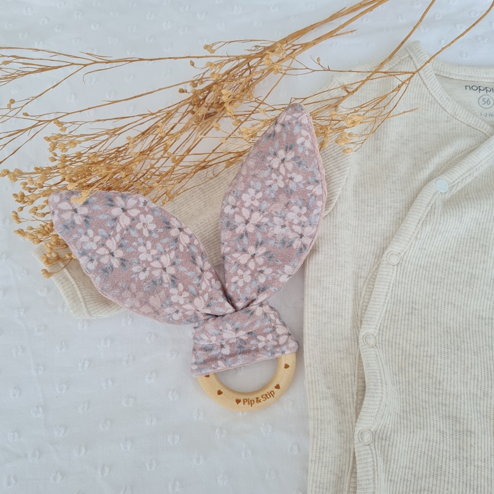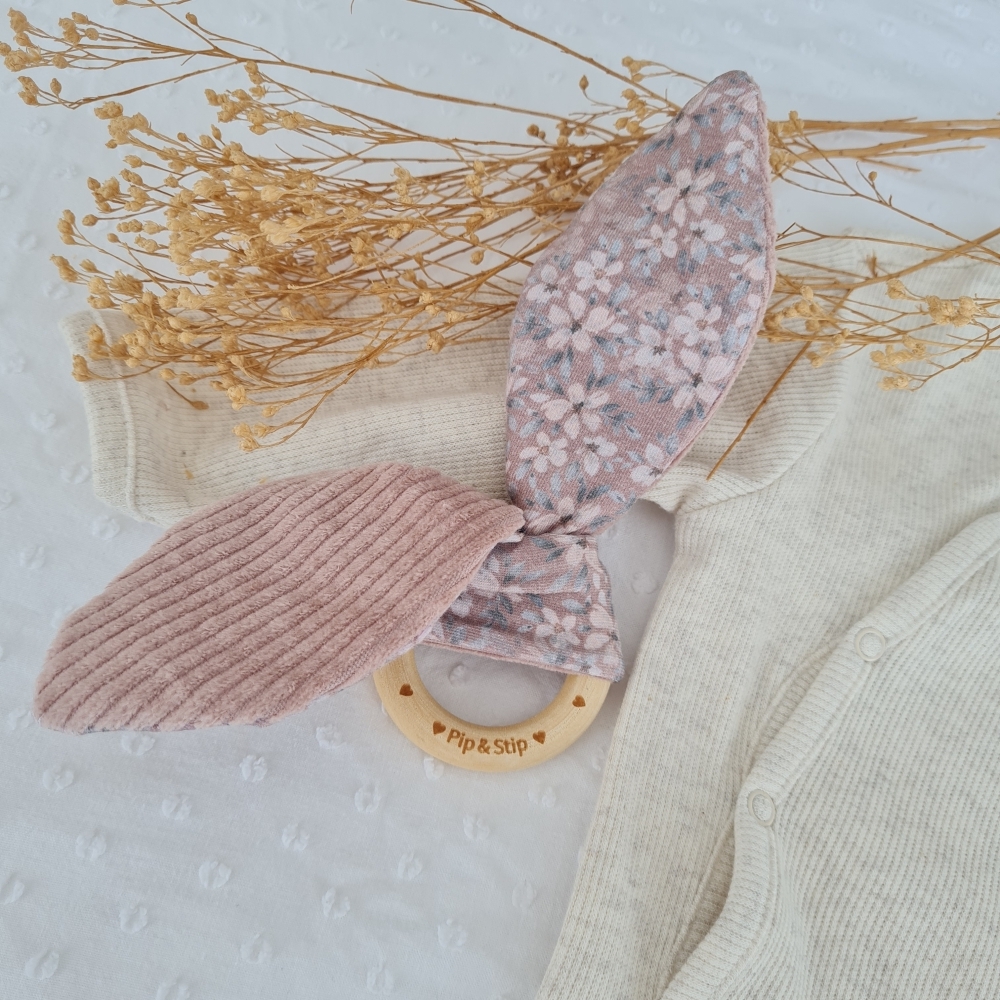 Baby's zijn dol op voelen en geluidjes. De knisper konijnen oortjes maken een knisperend geluid. Deze knisperoortjes hebben aan de ene kant een zachte tricot stof en de andere kant een rib stof. Door de verschillende structuren is het ook leuk om er aan te voelen. De houten ring maakt het makkelijk vast te houden.