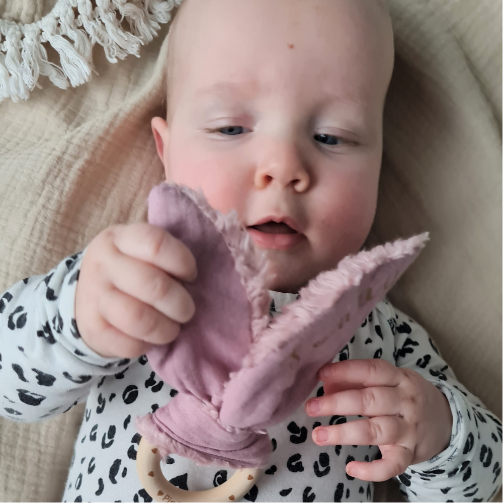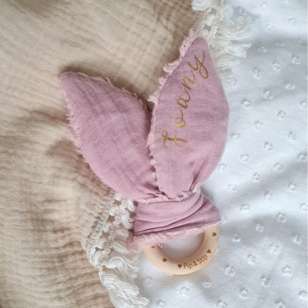 Baby's zijn dol op voelen en geluidjes. De knisper konijnen oortjes maken een knisperend geluid. Deze knisperoortjes hebben aan de ene kant een zachte hydrofiel stof en de andere kant een teddy stof. Door de verschillende structuren is het ook leuk om er aan te voelen. De houten ring maakt het makkelijk vast te houden.