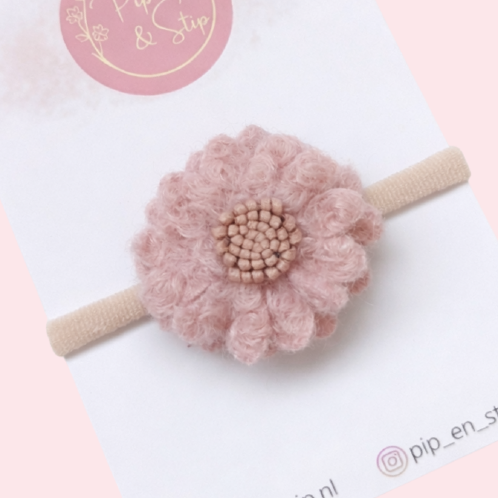 Een haarelastiek met wollen bloemen in lichte kleuren. Combineer het met een gebreid jurkje of een wollen truitje voor de ultieme winterstijl
