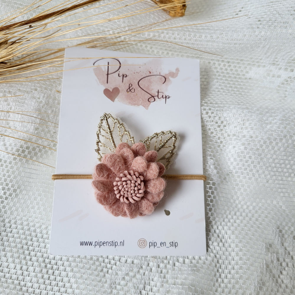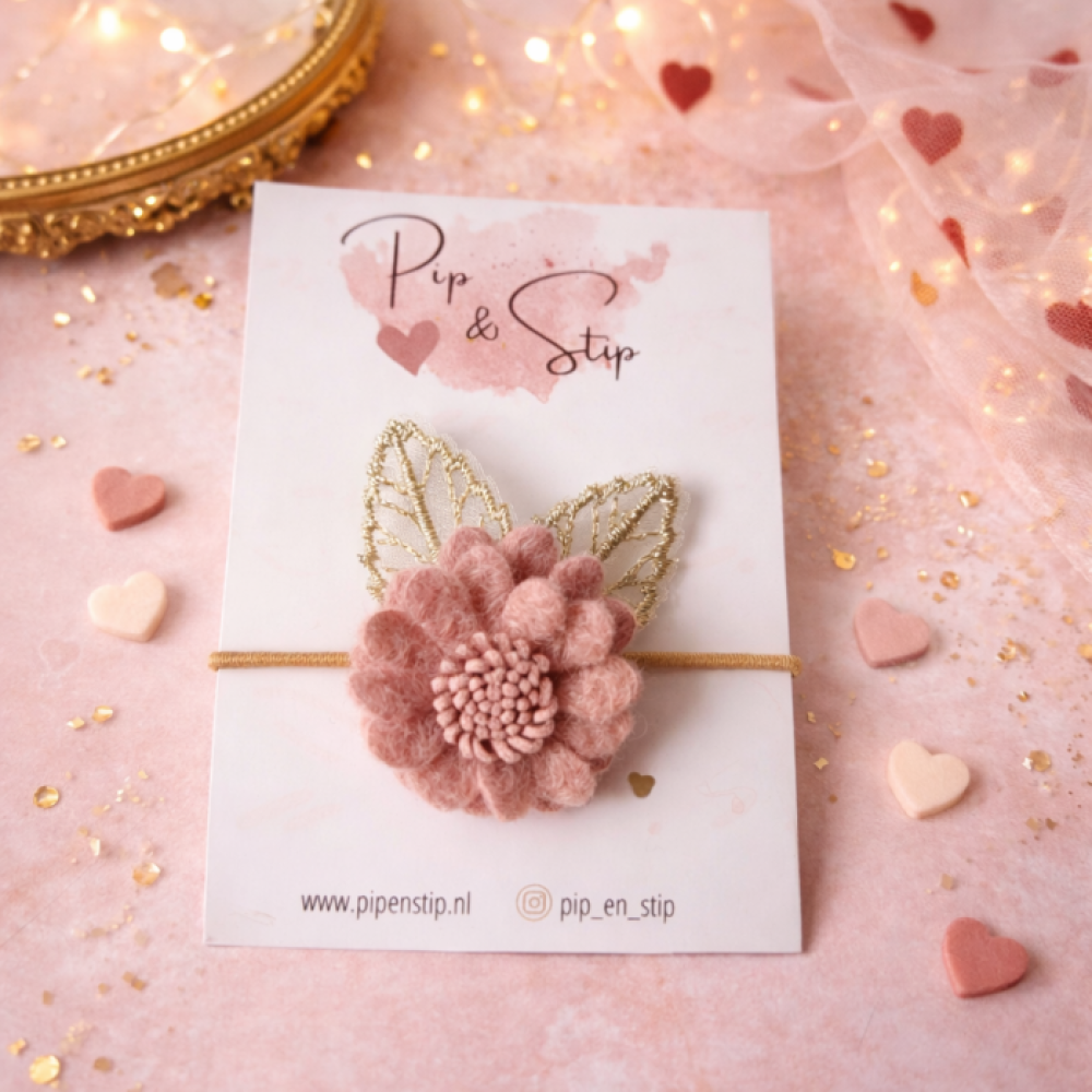 Voeg een vleugje zachtheid en elegantie toe aan elk kapsel met dit prachtige haarelastiekje. De bloem, gemaakt van zachte stof in een warme oudroze tint, is afgewerkt met subtiele gouden blaadjes die een speels maar stijlvol accent geven.