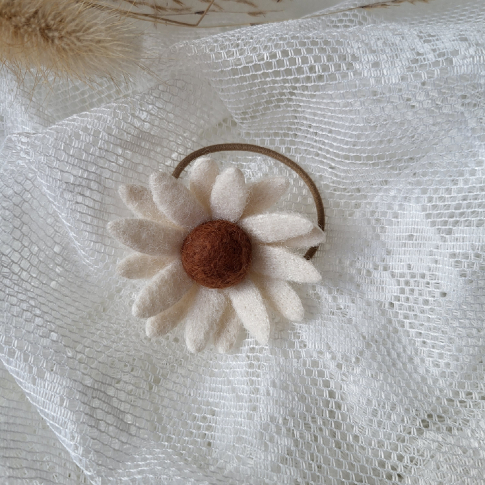 Een wollige bloem op een haarelastiek in warme herfstkleuren, gemaakt van wollen vilt. De bloem heeft een natuurlijke uitstraling en voelt heerlijk wollig aan. Ideaal voor een cosy winter of herfstlook. Combineer het met een gebreid jurkje of een wollen truitje voor een ultieme cosy stijl.