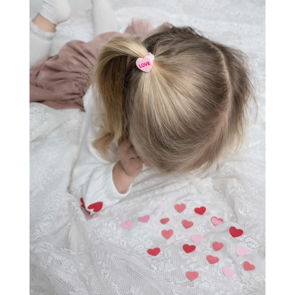 Deze lieve haarelastiekjes met snoephartjes zijn een echte eyecatcher voor Valentijnsdag. De elastiekjes hebben een diameter van ongeveer 2 cm en zijn zacht en comfortabel, waardoor ze fijn zijn voor kleine haartjes. De roze hartjes met de tekst LOVE geven een speelse en zoete uitstraling die perfect past bij feestelijke momenten, maar ook leuk is om het hele jaar door te dragen. Ideaal voor staartjes, vlechtjes of gewoon als schattig detail in het haar. Een klein, vrolijk accessoire dat elke outfit nét dat beetje extra liefde geeft