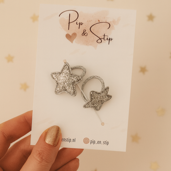 Setje van 3 mini haarelastiekjes met een glitter sterretje. In de kleuren goud, rosé en zilver.