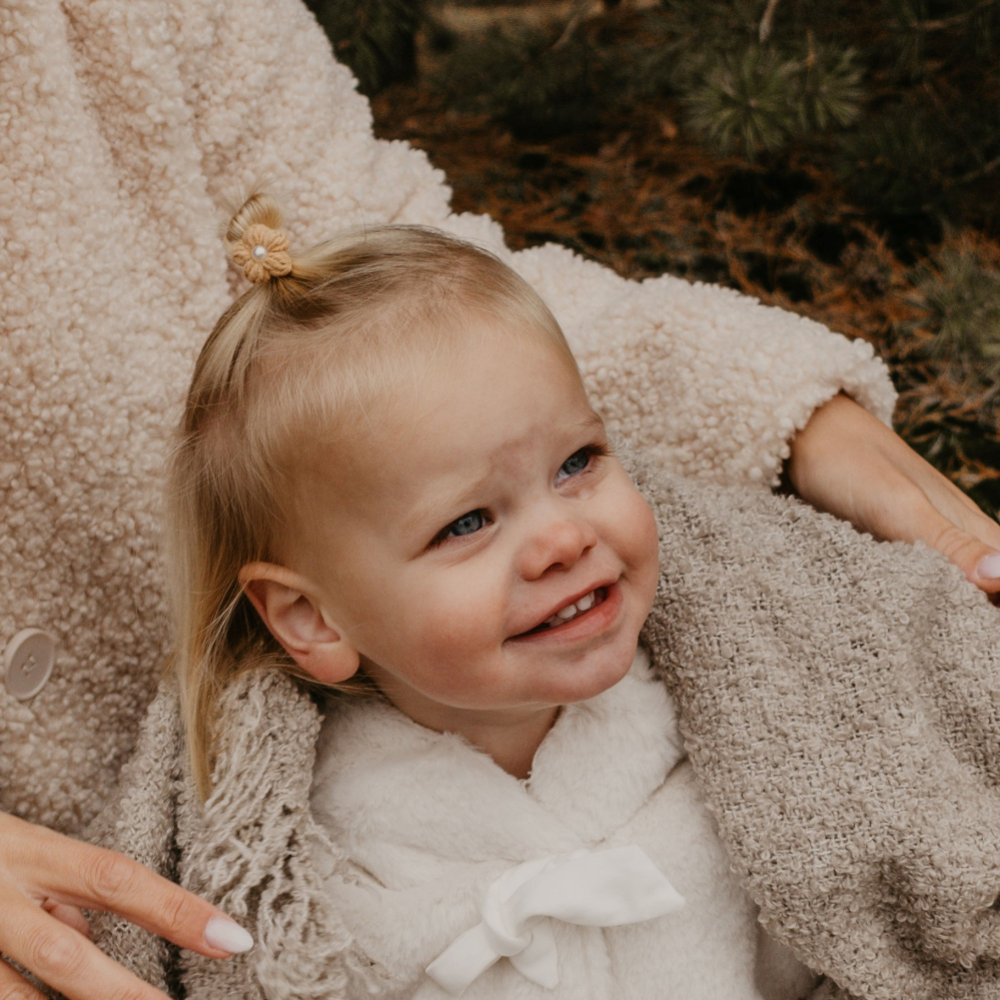De stoffen haarelastiekjes (2 cm) zijn zacht en rekbaar, en daardoor geschikt voor baby’s, peuters en kleuters.