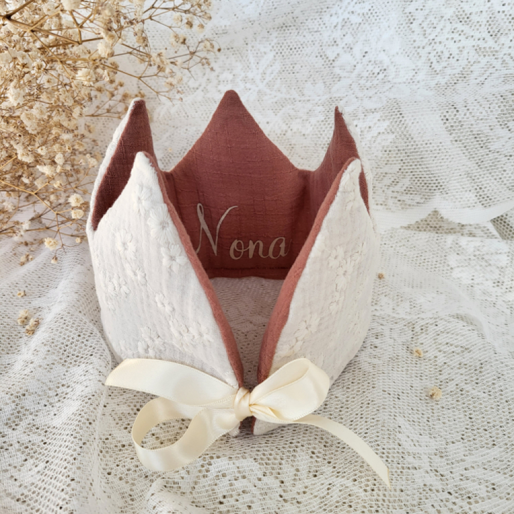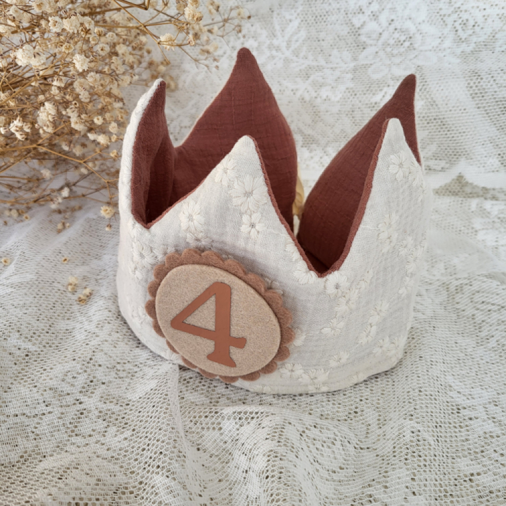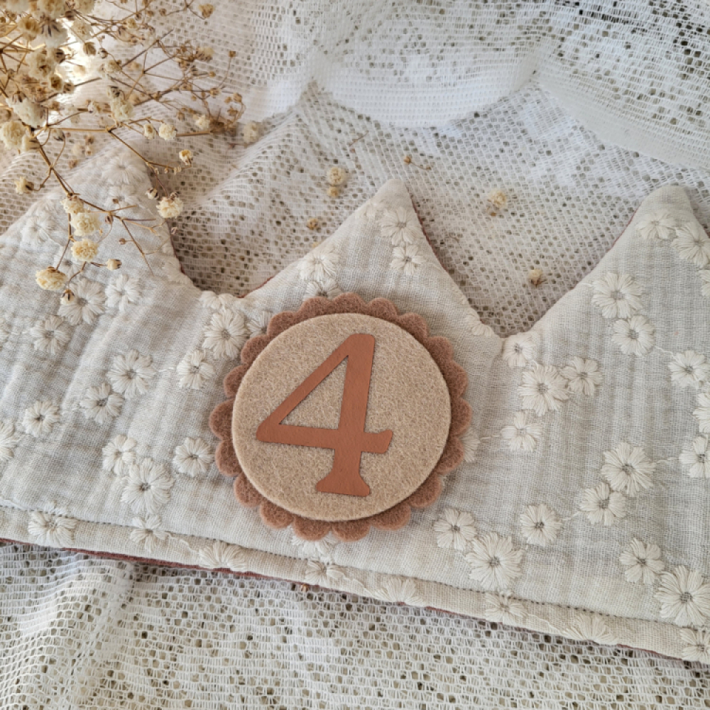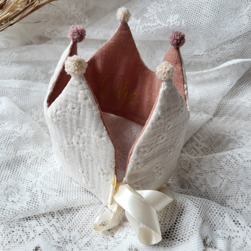 Deze vrolijke verjaardagskroon van broderie creme (stof 3) en bamboe stof oudroze maakt het feest compleet!