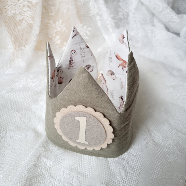 Deze vrolijke verjaardagskroon van hydrofiel olijf (stof 9) en katoen bosdieren (stof 27) maakt het feest compleet!