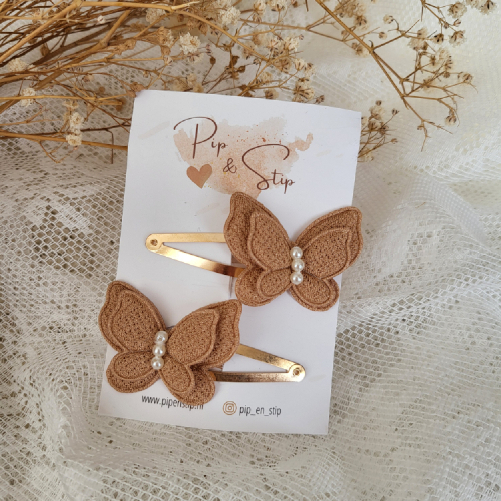 Twee haarspeldjes met bruine vlinders en parels.