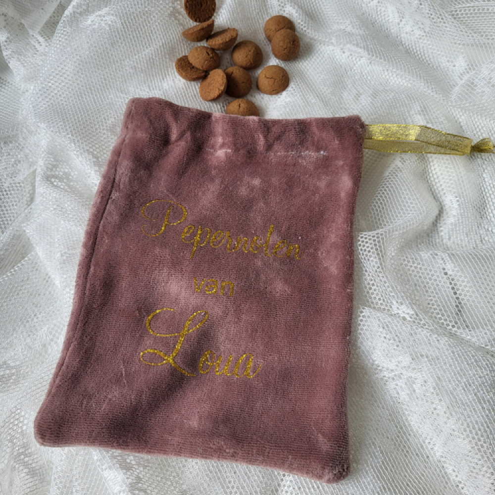 Het zakje is gemaakt van nicky velours en is ongeveer 15 x 20 cm groot. Daar passen heel wat pepernootjes in!