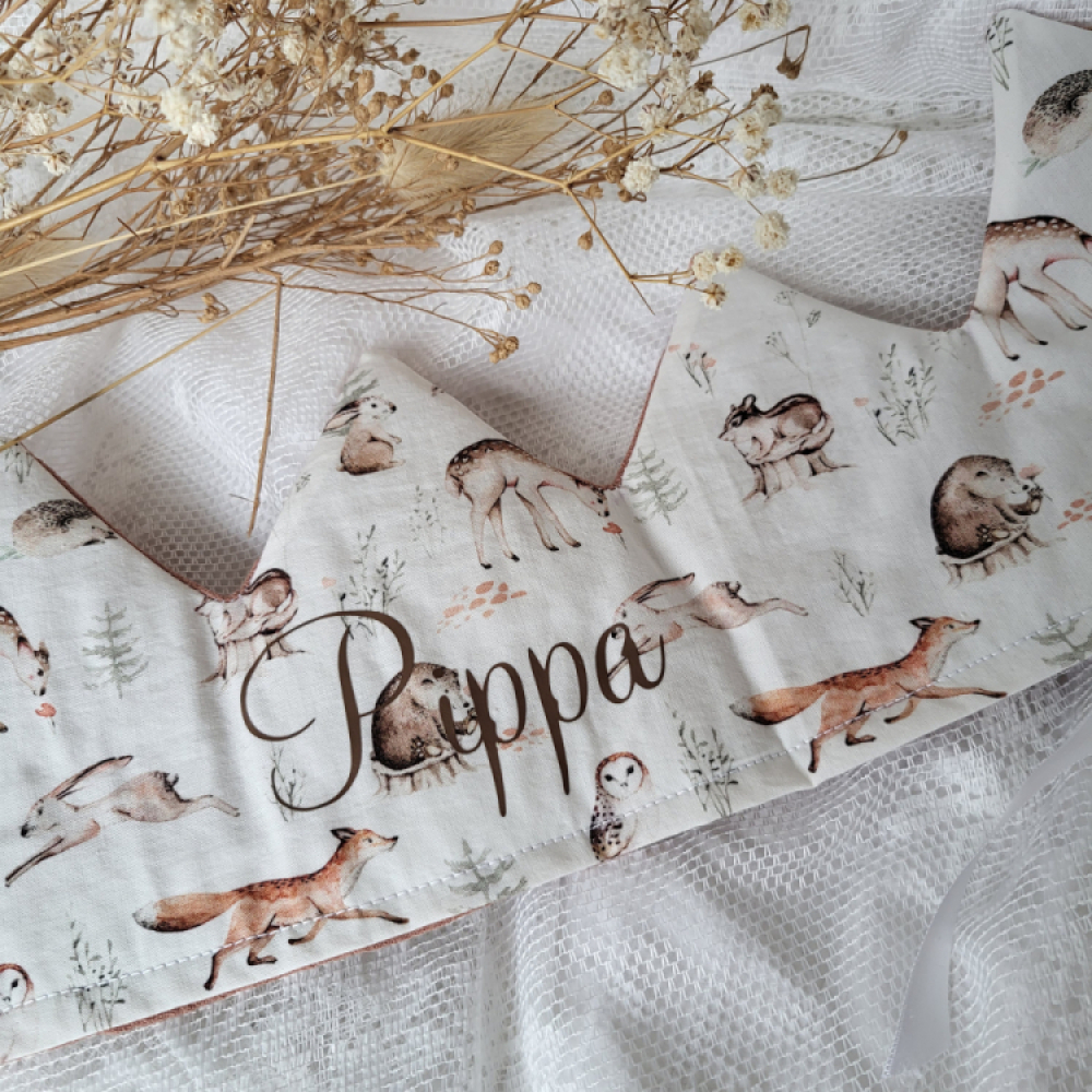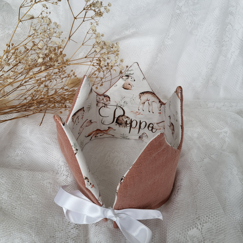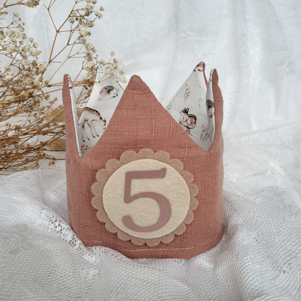 Deze vrolijke verjaardagskroon van bamboe oudroze (stof 16) en katoen bosdieren (stof 27) maakt het feest compleet!