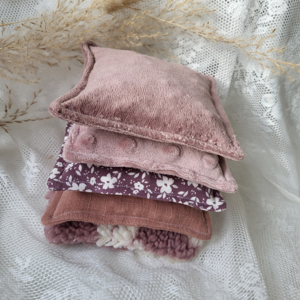 Deze set van vijf pittenzakjes in mauve tinten is met veel liefde handgemaakt en gevuld met 100% natuurlijke kersenpitten. Elk zakje voelt nét iets anders door de verschillende stoffen, waardoor kinderen op een speelse manier worden uitgenodigd om te voelen, ontdekken en experimenteren. De zakjes zijn ongeveer 12 × 12 cm groot, wegen zo’n 100 gram en zijn daardoor perfect voor kleine handjes – van baby’s die willen grijpen en voelen tot peuters en kleuters die gooien, stapelen, sorteren, balanceren en rollenspellen bedenken.