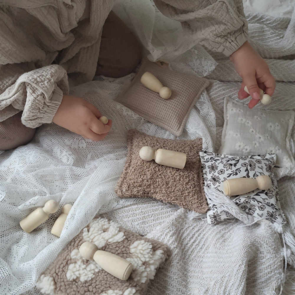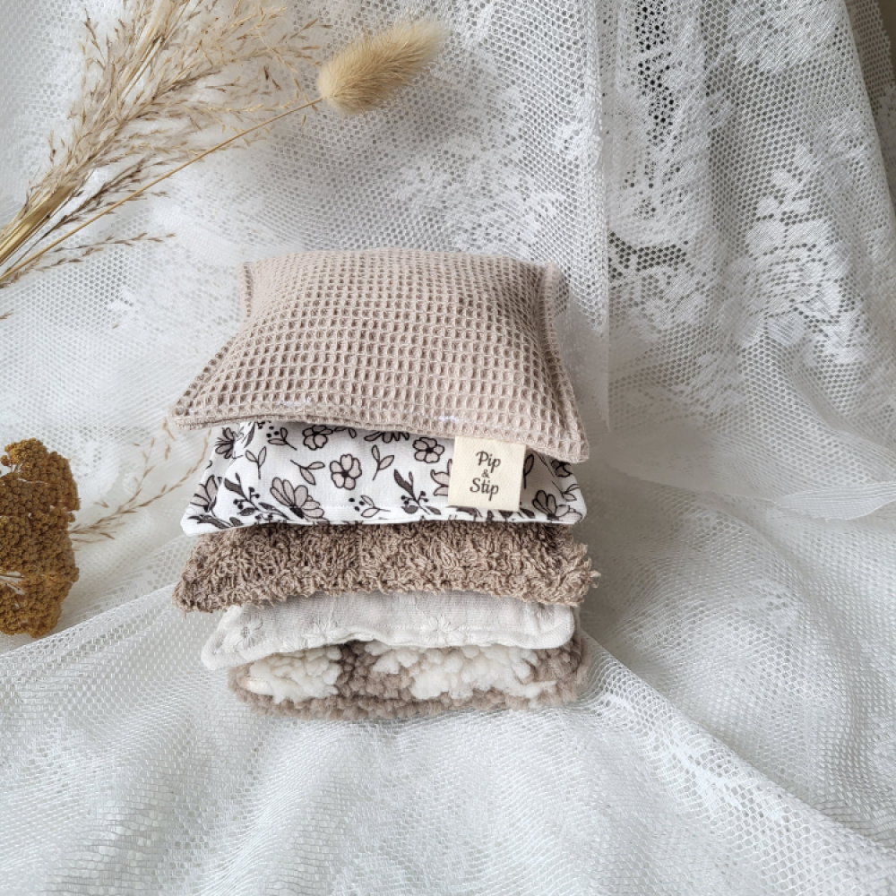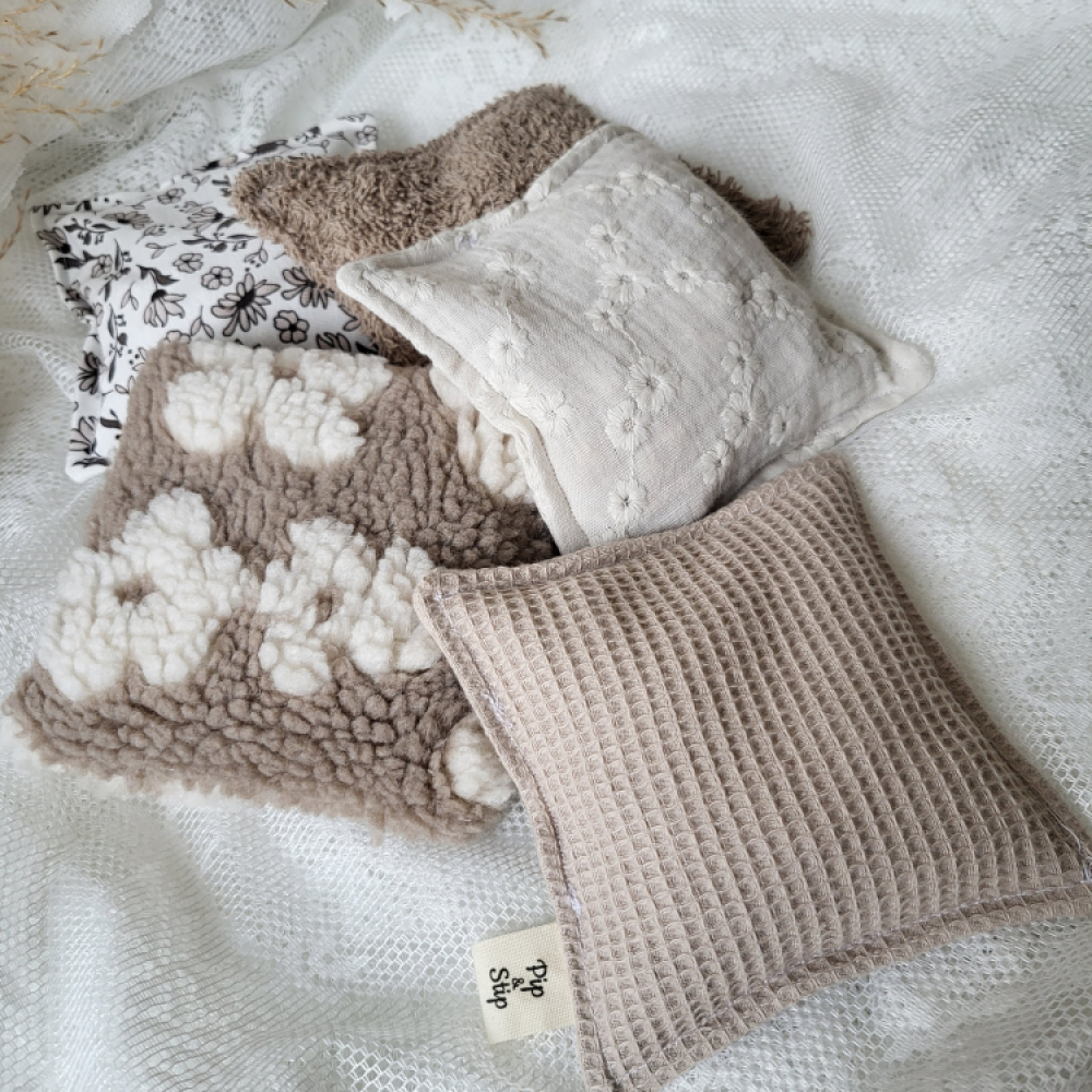 Deze set van vijf pittenzakjes in beige tinten is met veel liefde handgemaakt en gevuld met 100% natuurlijke kersenpitten. Elk zakje voelt nét iets anders door de verschillende stoffen, waardoor kinderen op een speelse manier worden uitgenodigd om te voelen, ontdekken en experimenteren. De zakjes zijn ongeveer 12 × 12 cm groot, wegen zo’n 100 gram en zijn daardoor perfect voor kleine handjes – van baby’s die willen grijpen en voelen tot peuters en kleuters die gooien, stapelen, sorteren, balanceren en rollenspellen bedenken.